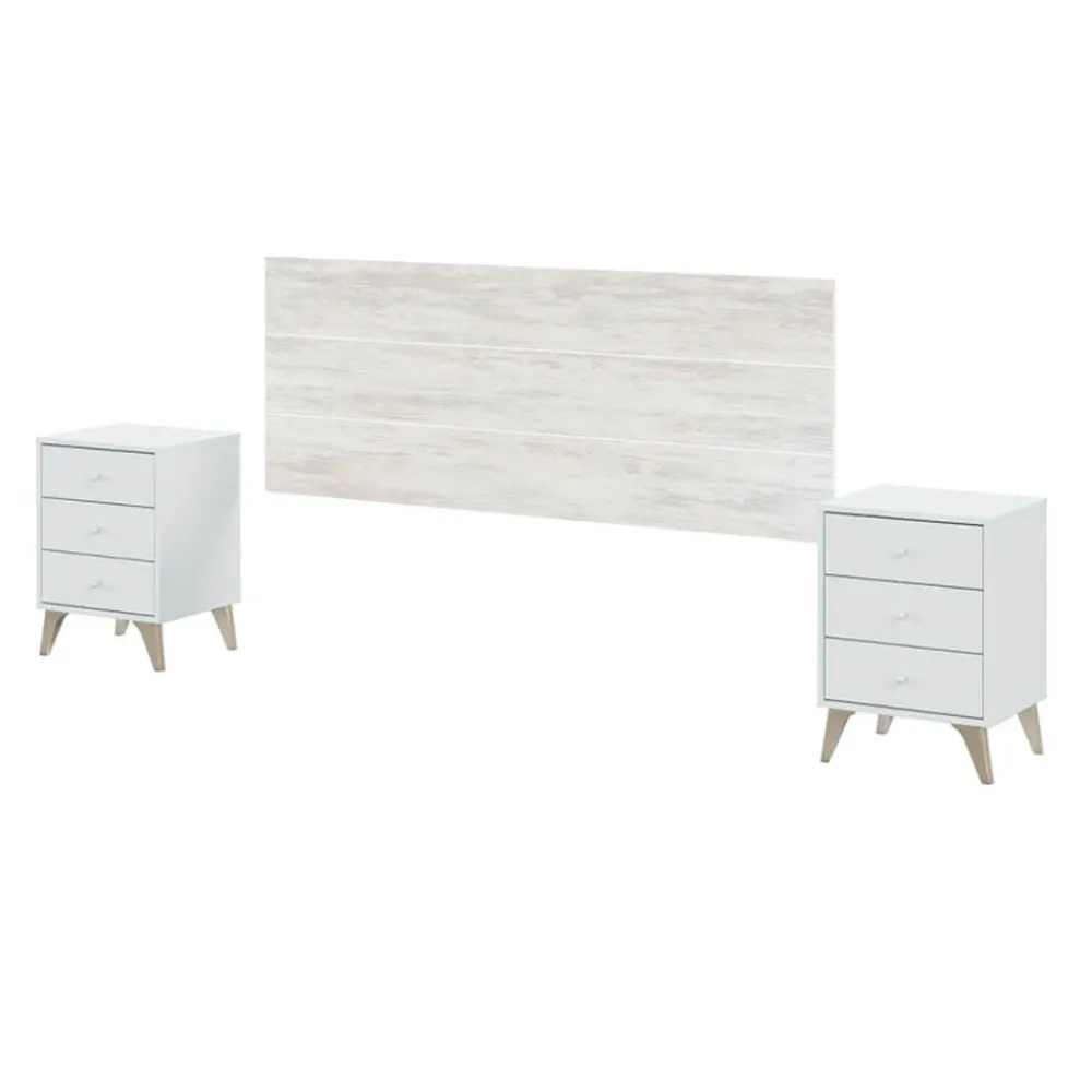 El en color blanco Velho, acompañado por dos mesitas de noche en color blanco Artik, crea un ambiente armonioso y acogedor. Las mesitas, con tres cajones cada una, ofrecen un amplio espacio de almacenamiento para tus objetos personales. Los tiradores en forma de pomo y las patas de las mesitas añaden un toque retro que realza el encanto del conjunto. El acabado en tonos blancos y madera clara aporta luminosidad y frescura al dormitorio, adaptándose fácilmente a diferentes estilos decorativos.