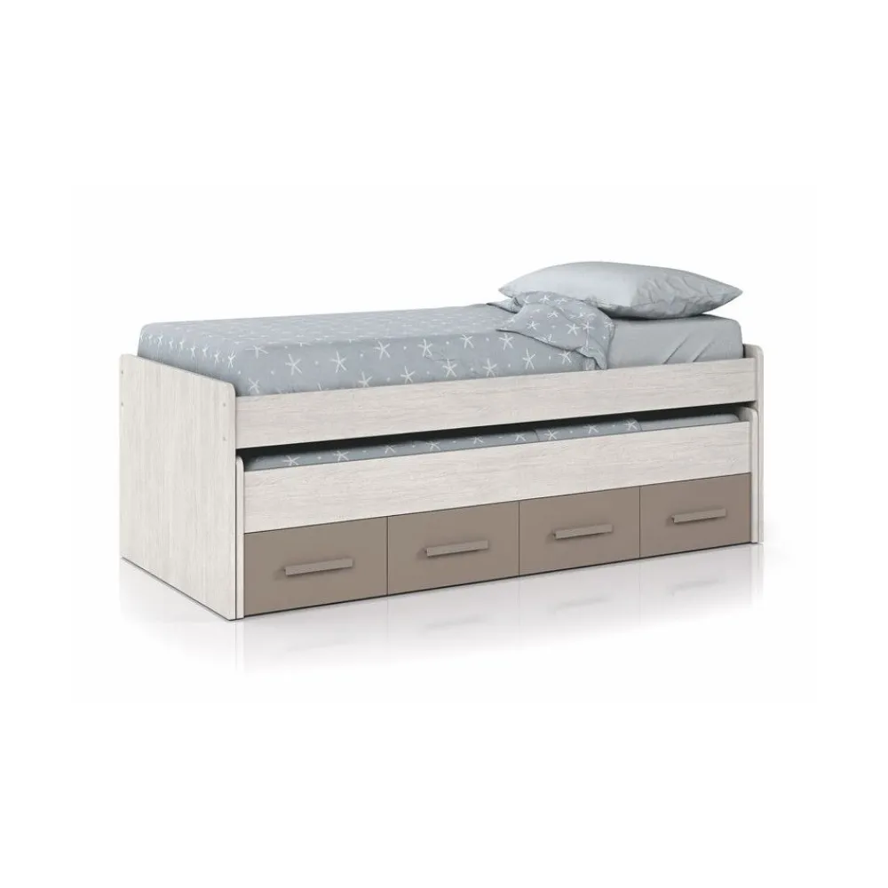 Cama juvenil Ares doble, con dos cajones en la parte inferior, incluye dos somieres del mismo material que la cama y el armario juvenil de dos puertas.