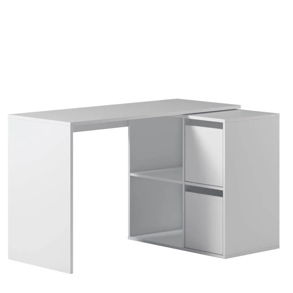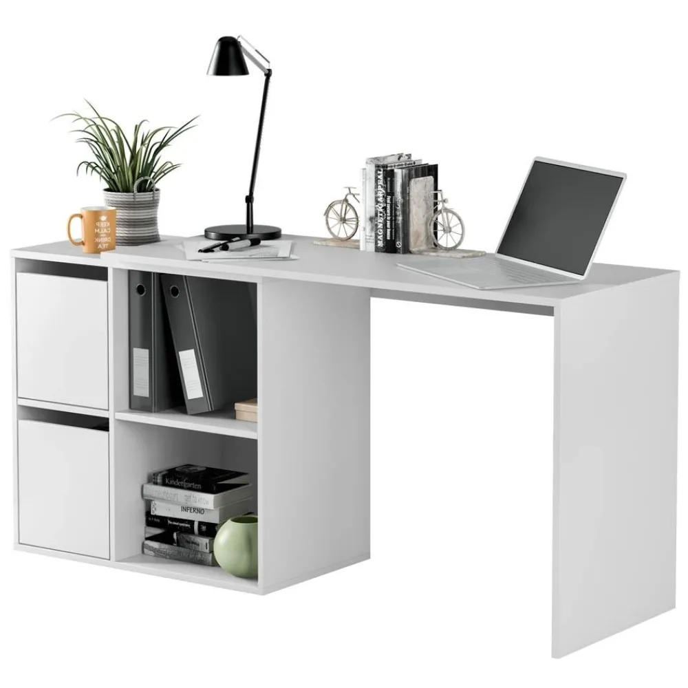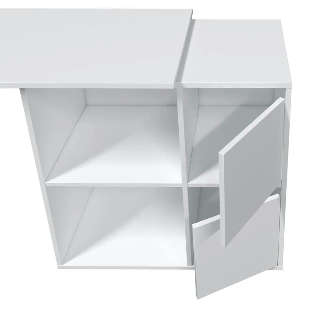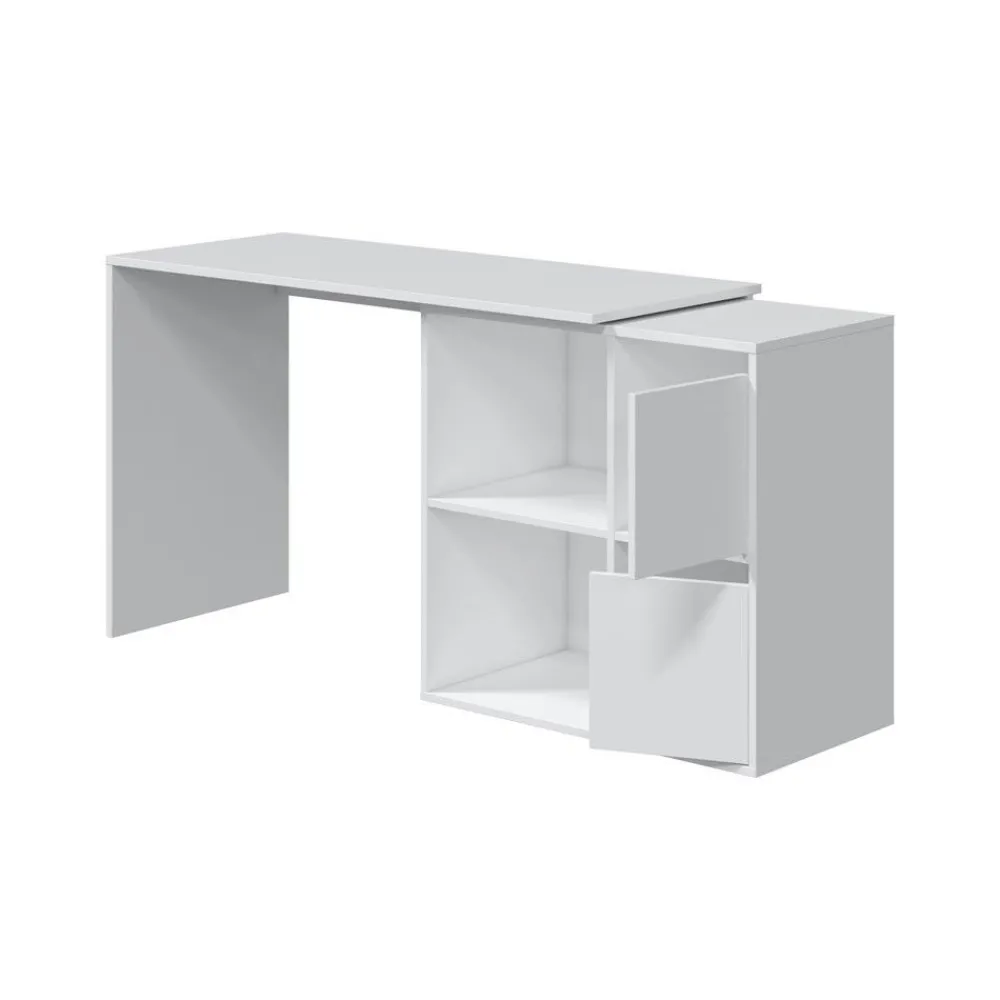 Escritorio angular o recto con un mueble con dos huecos y dos puertas. Una mesa de estudio que se adapta a tus necesidades. Se presenta en acabado blanco Artik.