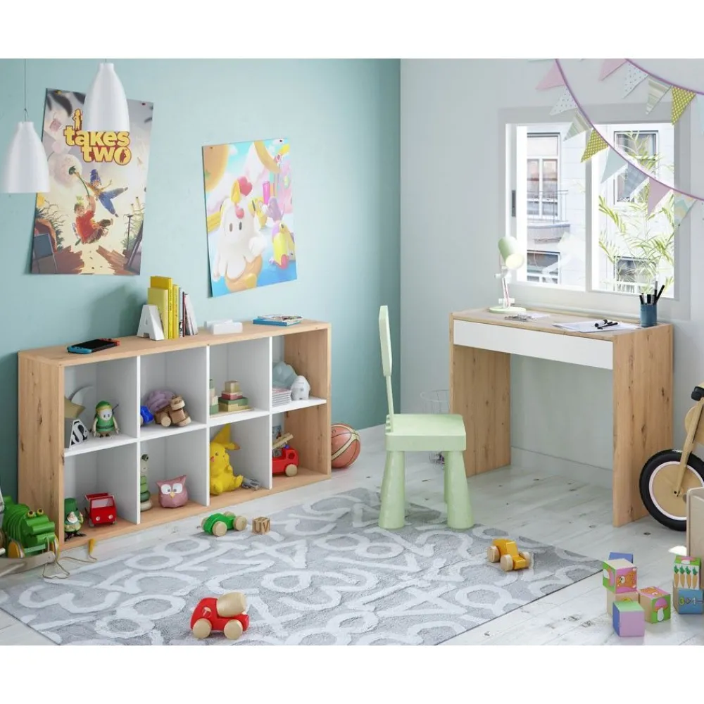 Mesa de estudio en color Roble Nodi que dispone de un amplio cajón con el frente en color blanco Artik. Acompáñala con la estantería Noa, para hacer una bonita zona de estudio.