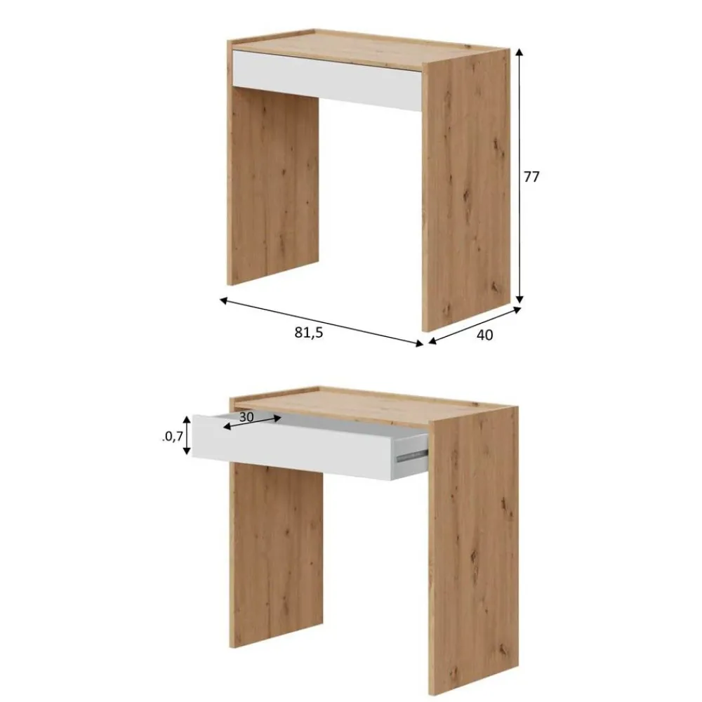 Mesa escritorio sencilla en color roble Nodi, con un amplio cajón en color blanco Artik. Una mesa de estudio juvenil, muy útil y que es le complemento perfecto de cualquier habitación infantil.