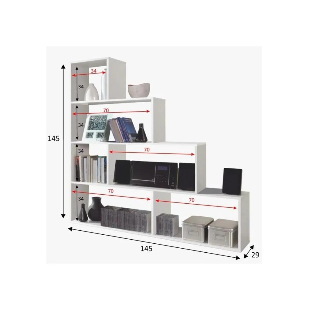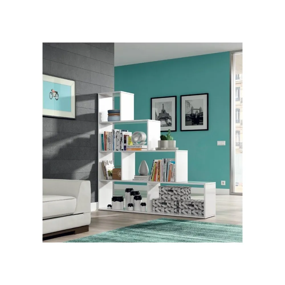 La estantería, librería Klum en color blanco brillo, es una estantería en forma de escalera, con 6 huecos asimétricos. Puede utilizarse tanto de estantería de pared como de separador de ambientes tanto en un salón como en una habitación.