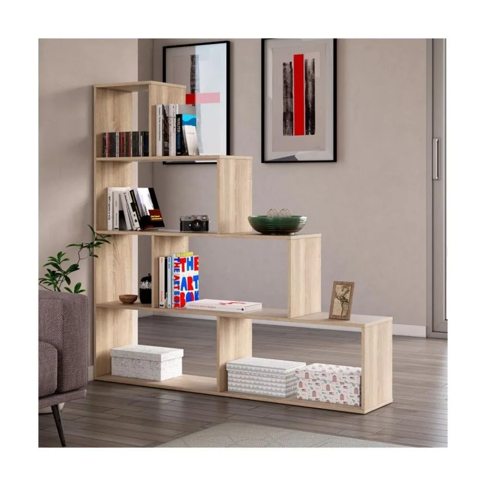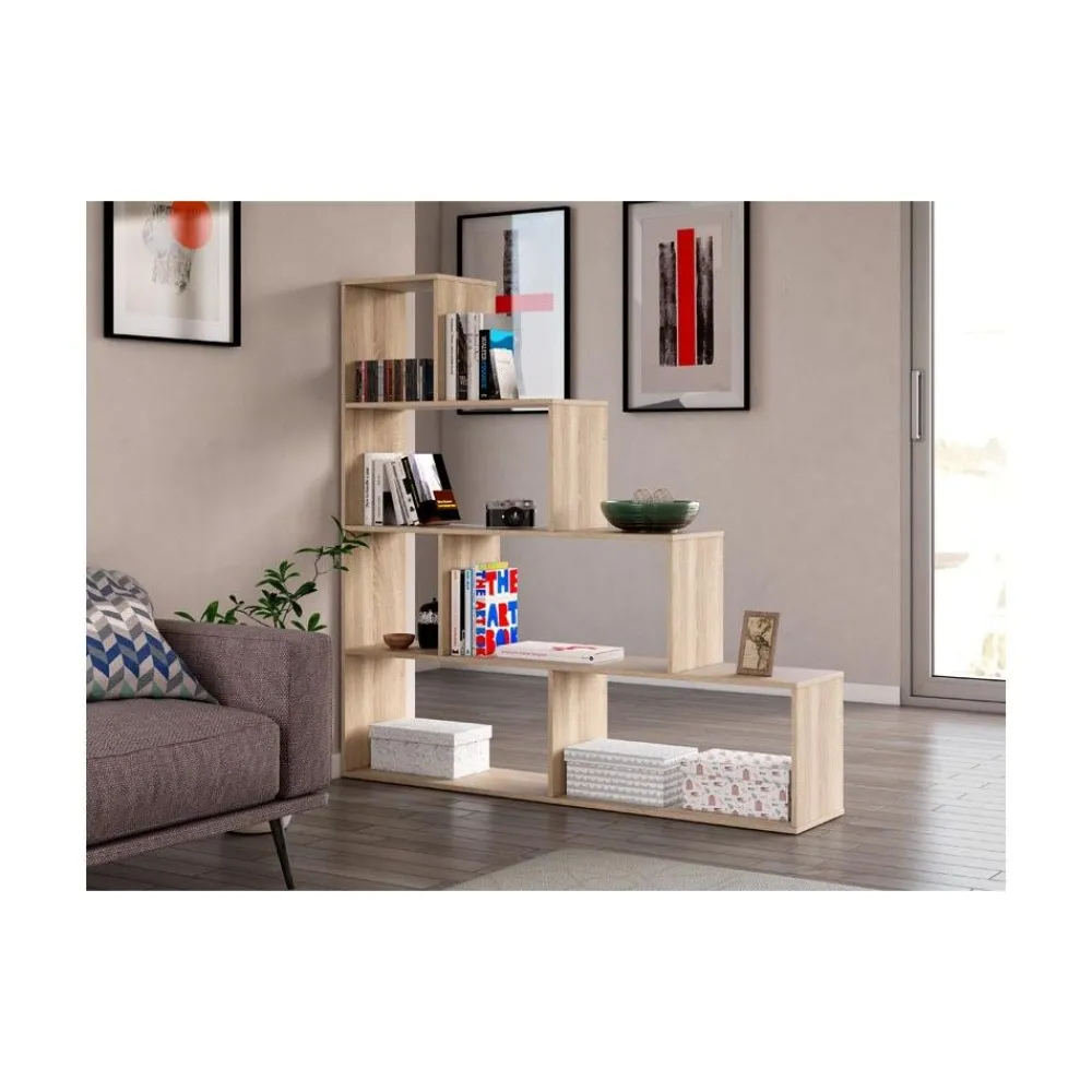 La estantería de pared barata roble Canadian Klum, con su singular diseño en forma de escalera, está divida en seis huecos irregulares, tres más grandes y tres más pequeños.