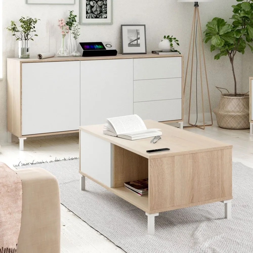 Una mesa de café para tu salón, que destaca por su diseño sencillo pero muy útil, ya que debajo de la tapa dispones de dos amplios huecos para guardar revistas o colocar algún objeto decorativo. Una mesa resistente al ajetreo diario de tu salón, con gran estabilidad y realizada con materiales de gran calidad.