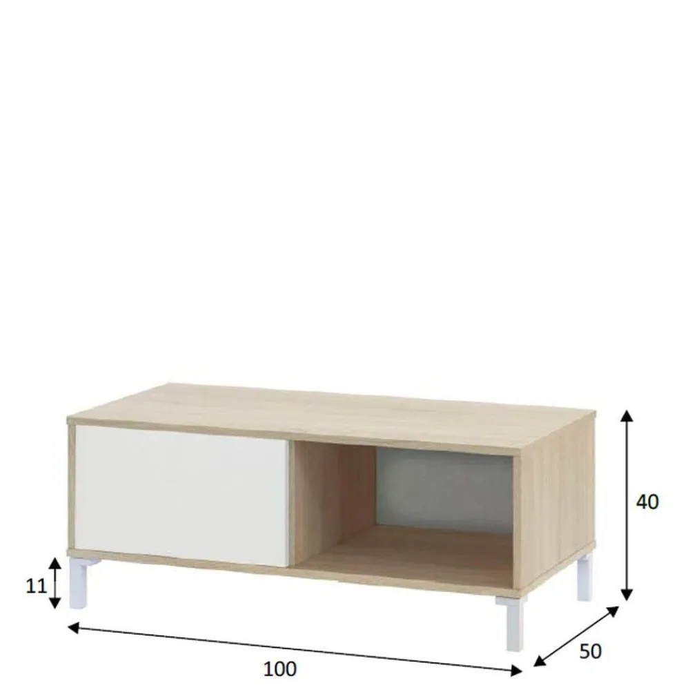 Una bonita mesa en color blanco Artik combinado con roble Canadian para completar la colección Bilbao de salón comedor. Se trata de una mesa auxiliar fija que cuenta con dos huecos decorativos en los que podemos guardar revistas o libros y en la que lo que más destaca, aparte de su cuidado diseño, son sus patas vistas en color blanco