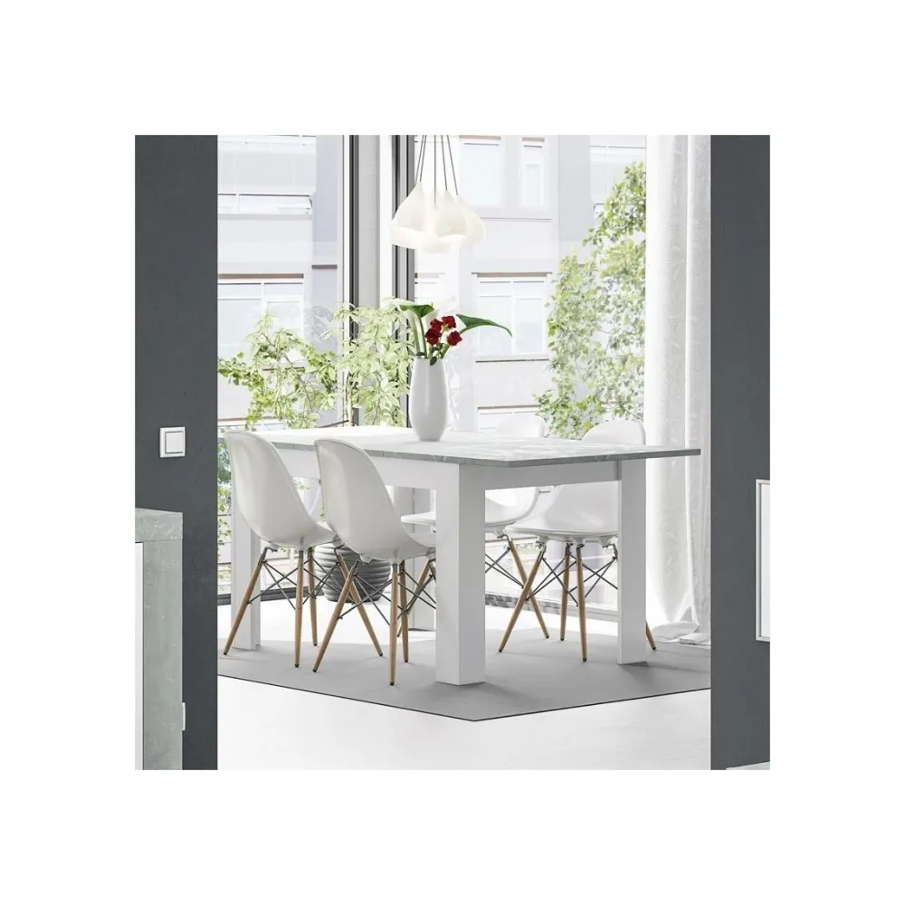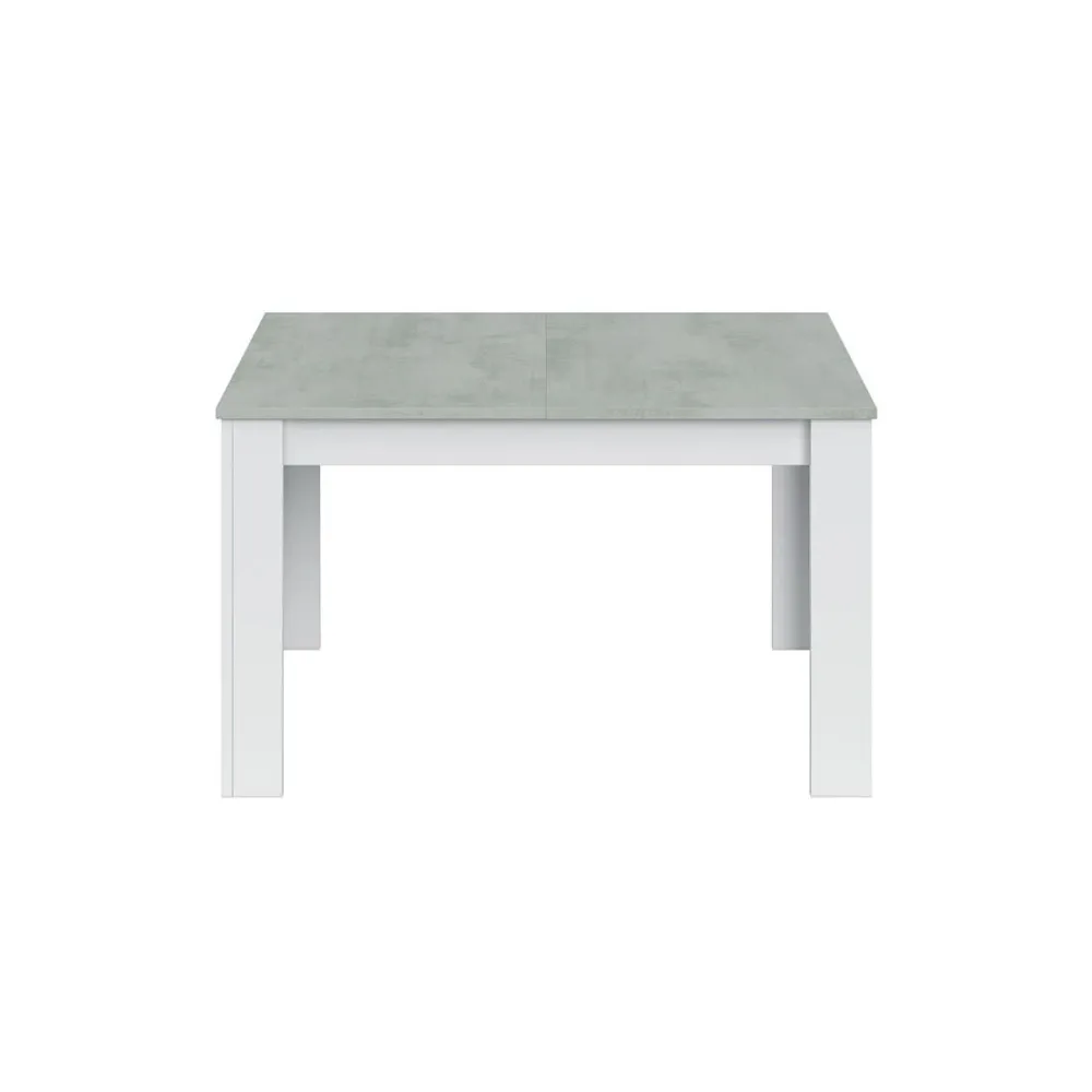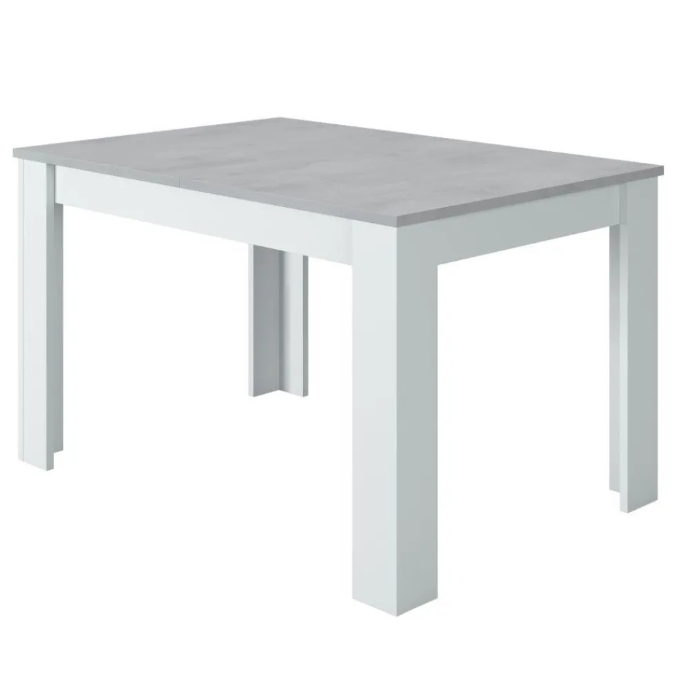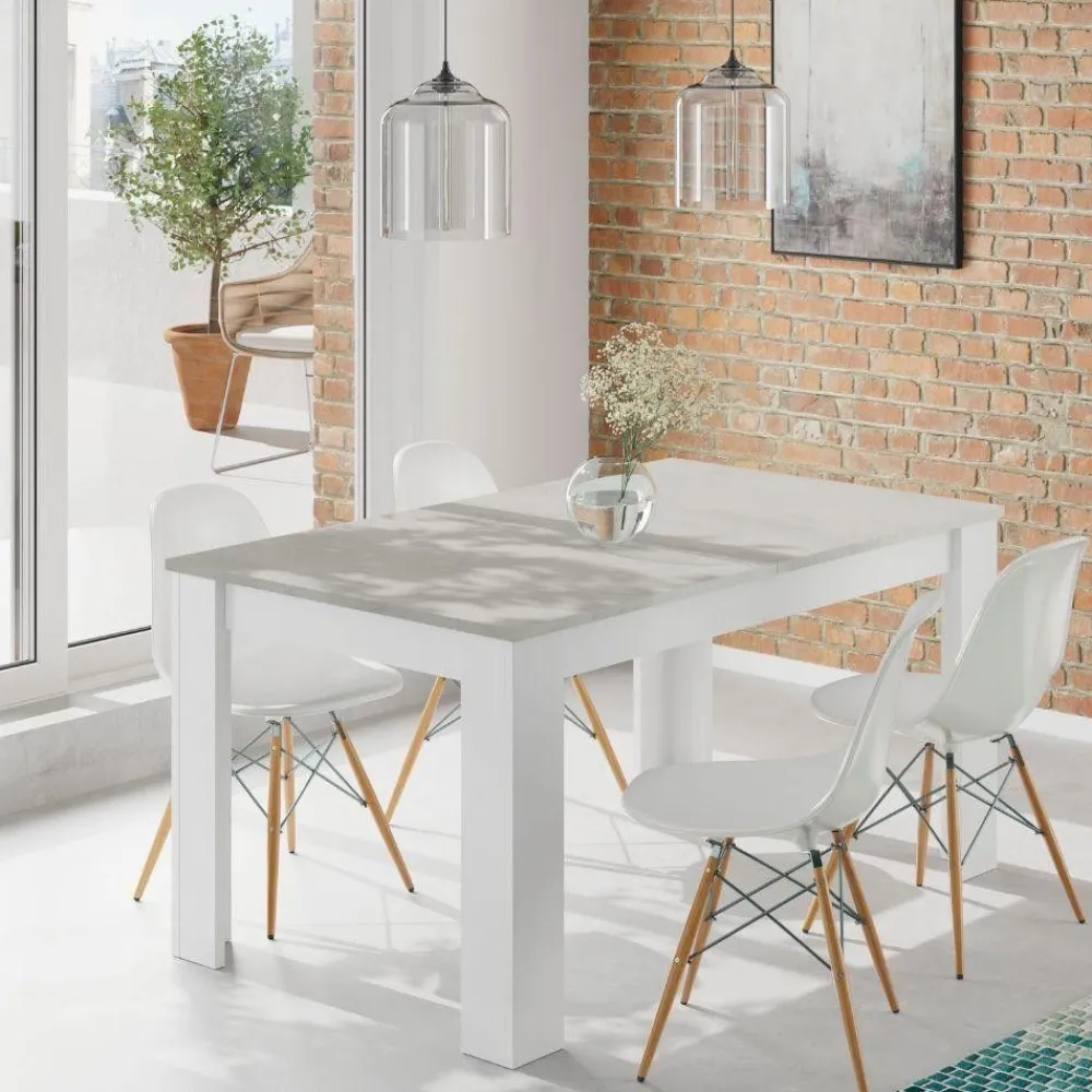 Una mesa para comer extensible Kendra es una opción perfecta para cualquier salón comedor. En este caso se trata de la mesa con encimera en color cemento y estructura en blanco Artik