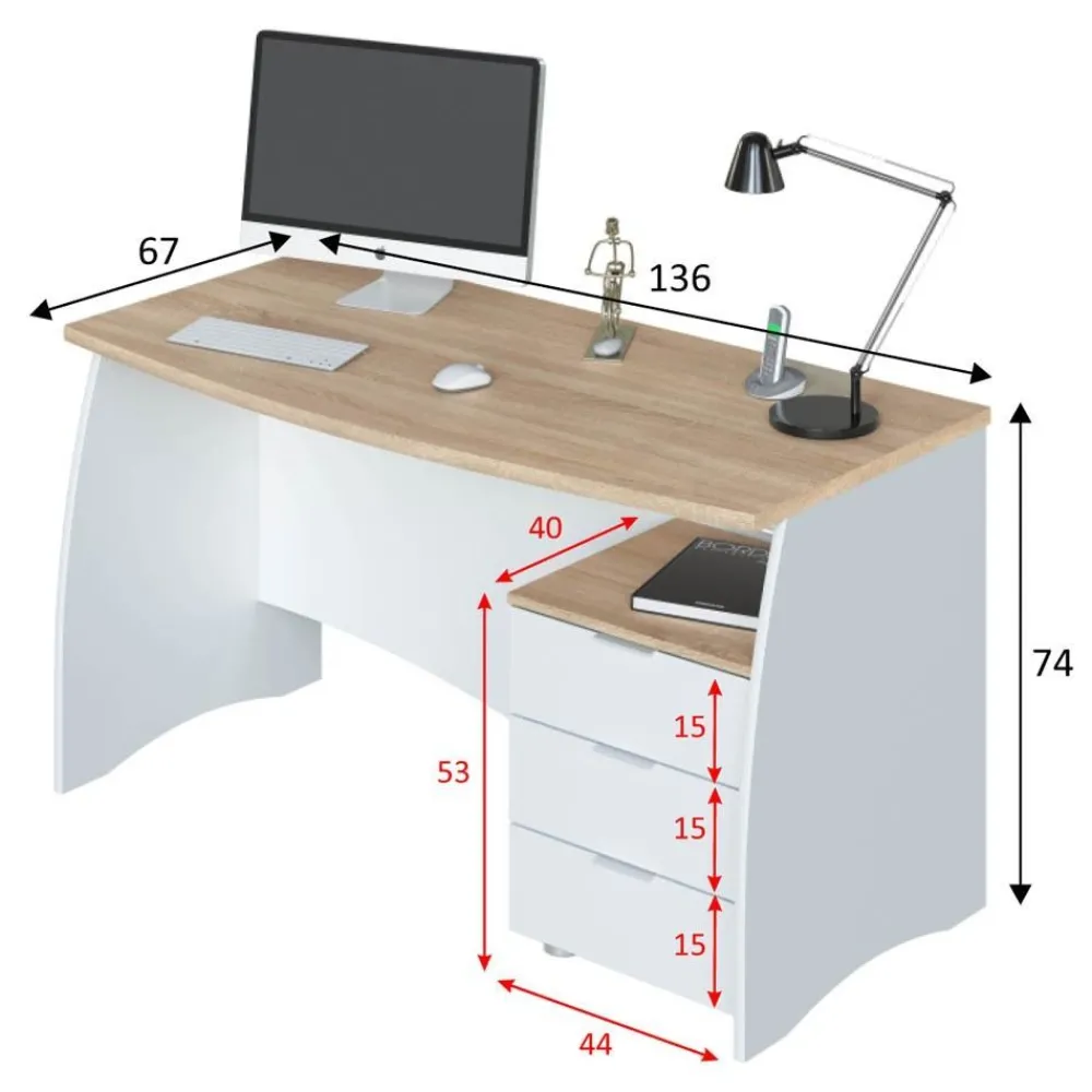 - Escritorio: 74 cm (alto) x 136 cm (ancho) x 67 cm (fondo)