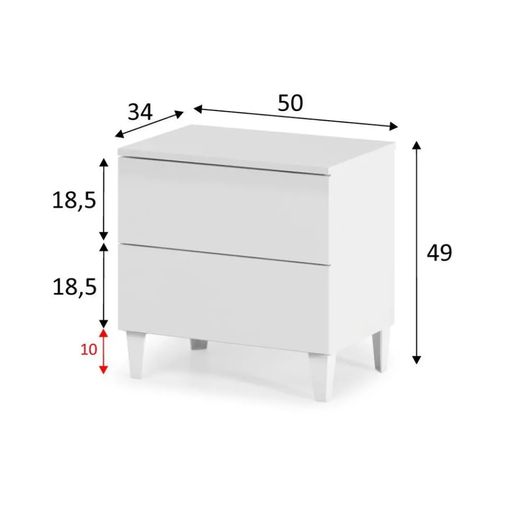 Una mesita de noche con patas en color blanco que aporta a tu dormitorio un ambiente acogedor y luminoso, además de poder guardar gran cantidad de cosas en cada uno de los cajones de la mesita.