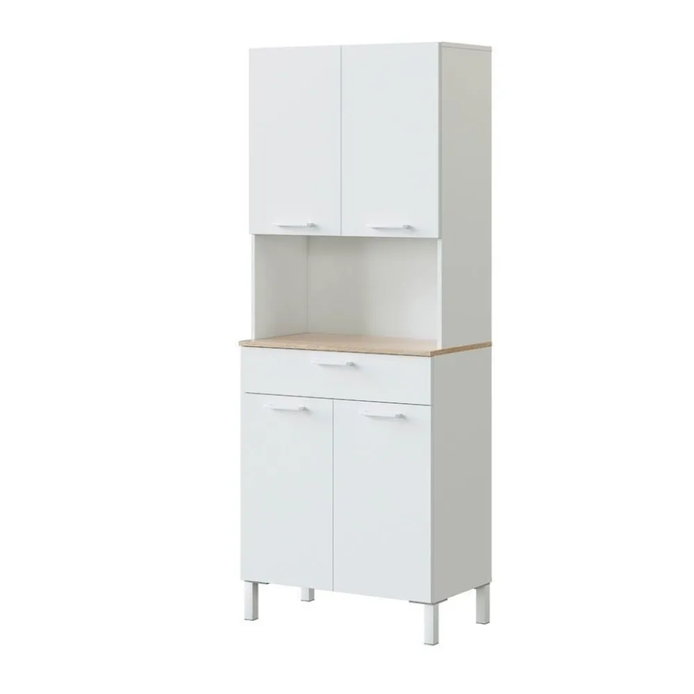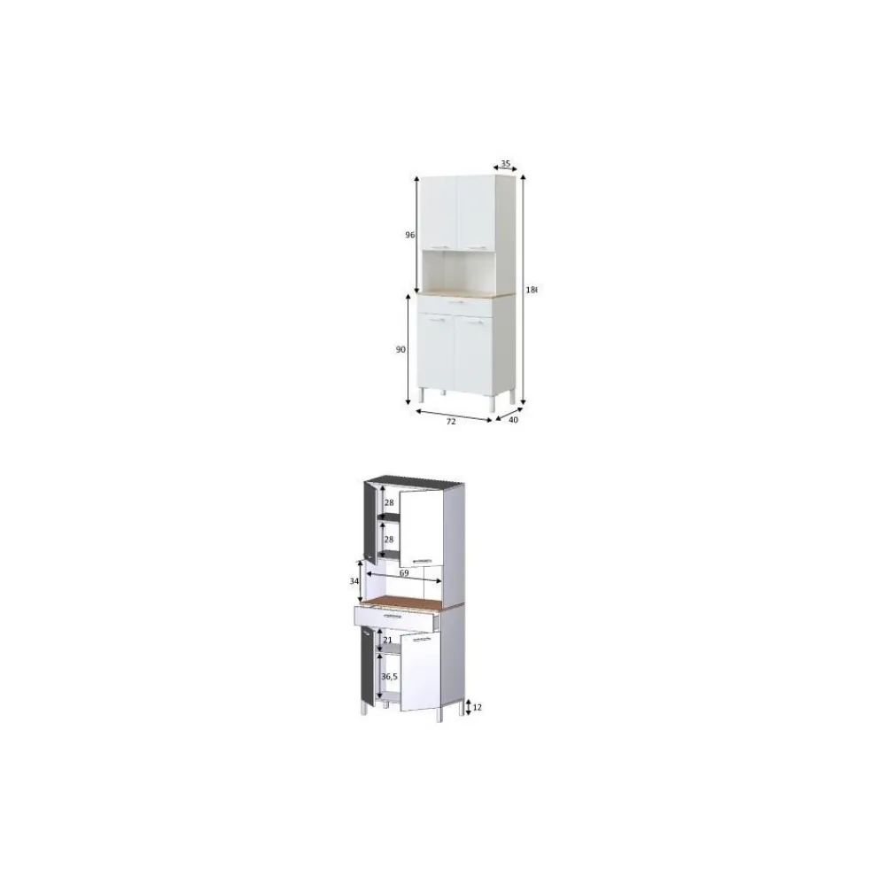 El mueble auxiliar de cocina Kira o alacena, es un mueble de cocina tipo columna con cuatro puertas y un cajón en blanco Artik dividido a la mitad por una encimera en roble Canadian. Cuenta con un hueco en el medio, sobre la encimera para colocar el microondas.