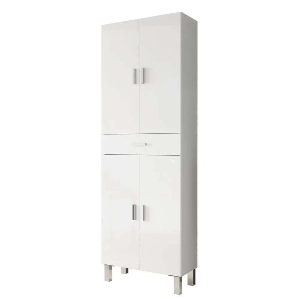 Columna de baño en color blanco brillo, con cuatro puertas y un cajón. Perfecta para aumentar la capacidad de almacenamiento de cualquier aseo.