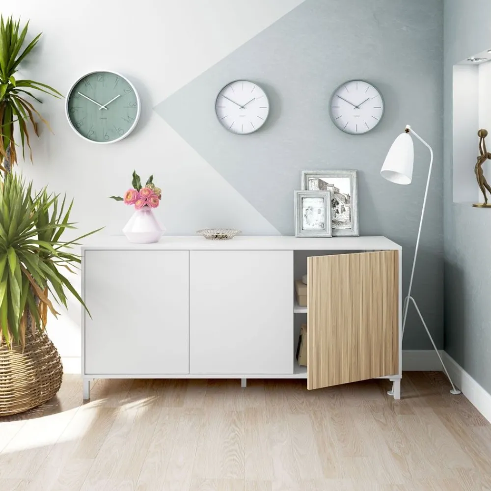 El aparador Ethna está cuidadosamente diseñado para aumentar la capacidad de almacenamiento de tu casa, con un diseño cuidado en color blanco Artik y Natur, destacará en cualquier rincón. El color Natur es un tono de roble con un dibujo de veta en vertical muy marcado, que nos aporta un toque moderno.