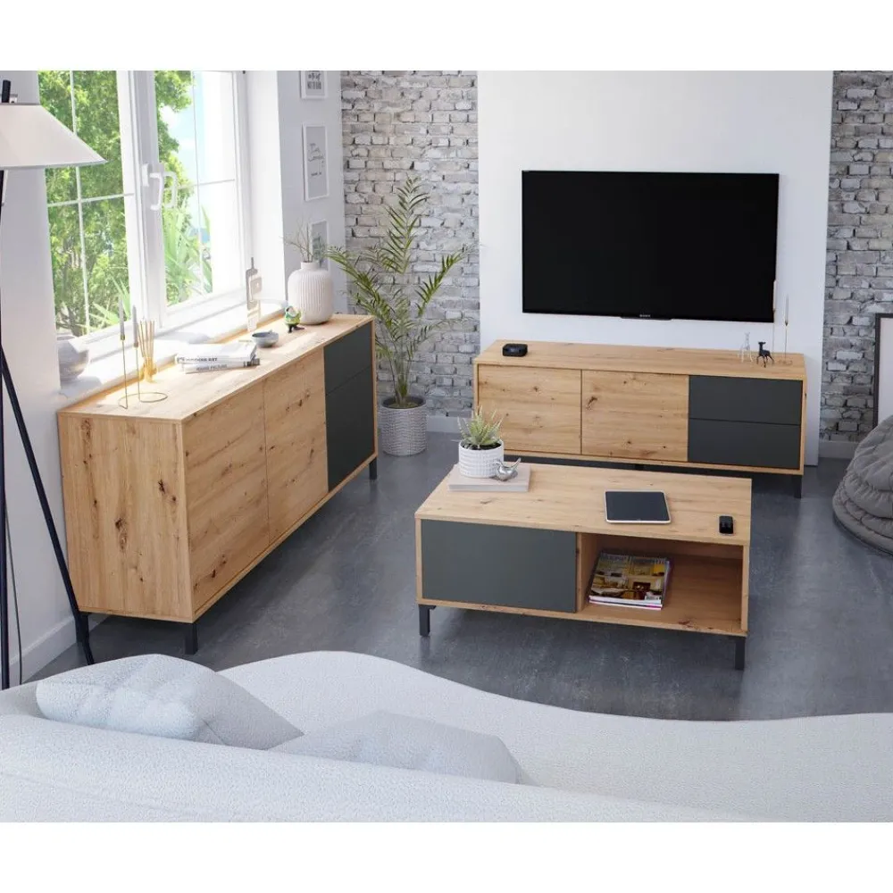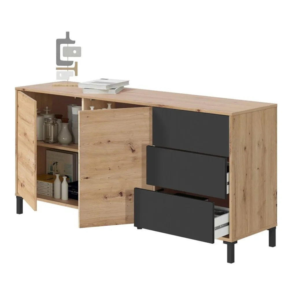 FORES Muebles De Salón^Aparador De Salón Brooklyn Roble Nodi – Antracita 2 Puertas + 3 Cajones 154 X 74 X 41 Cm