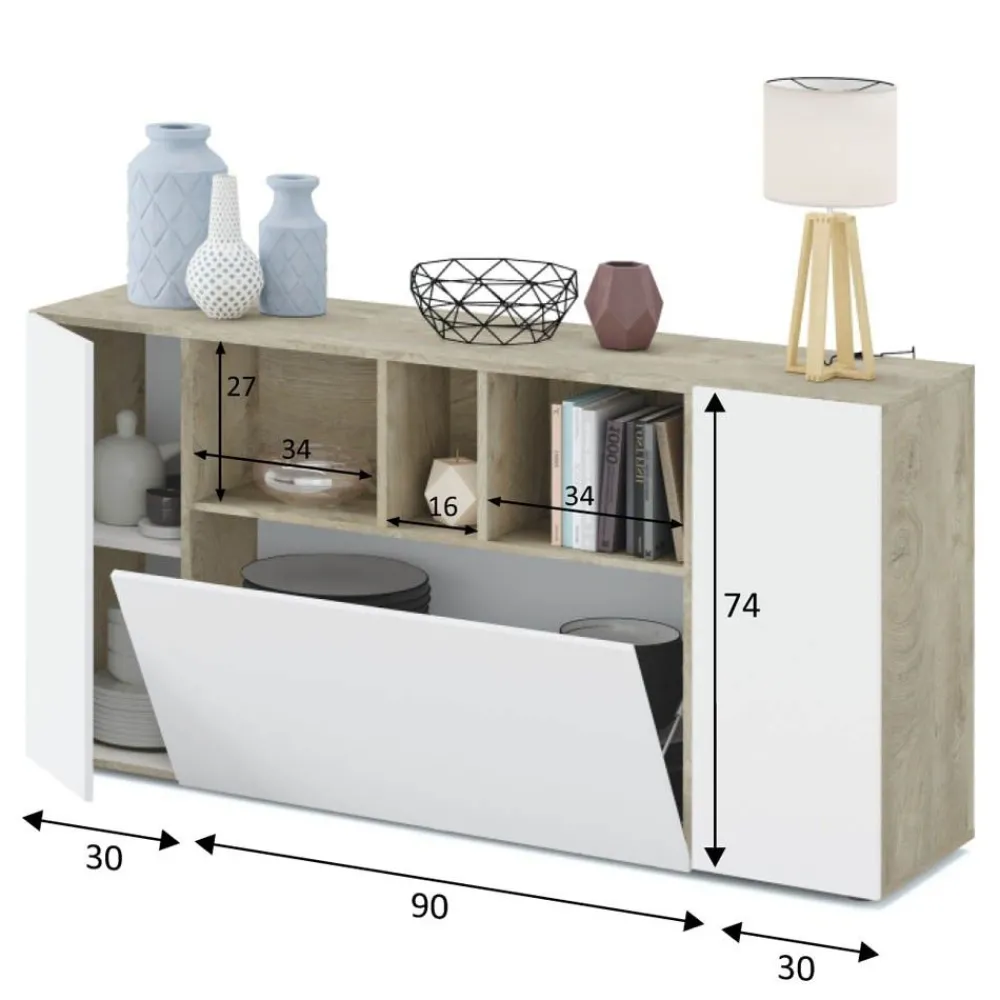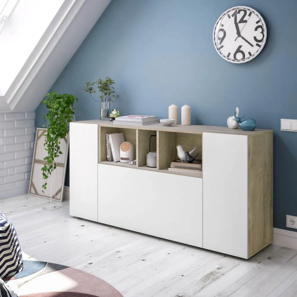 Aparador Loira Blanco Artik y Roble Alaska con 3 Puertas y Huecos