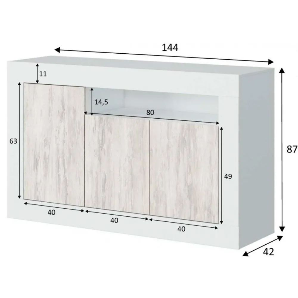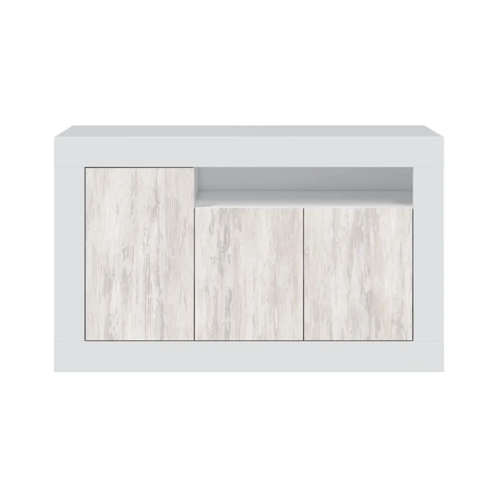 Aparador de estructura atamborada con tres puertas y un hueco. Se presenta en color blanco Artik combinado con blanco Velho.