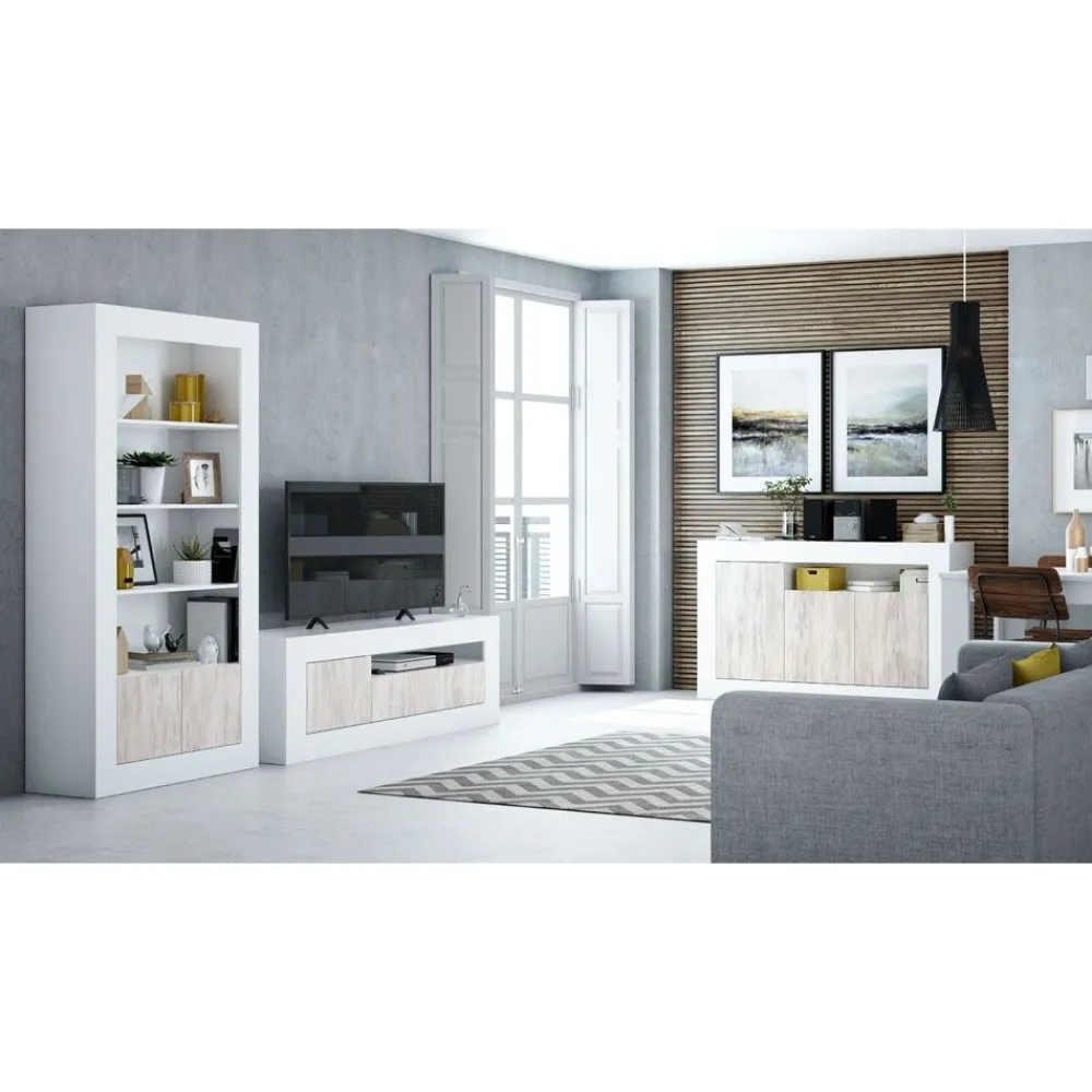 Bonito buffet aparador de tres puertas y con un hueco que combina el blanco Velho y el blanco Artik. Un aparador que aporta claridad al salón donde se instale.