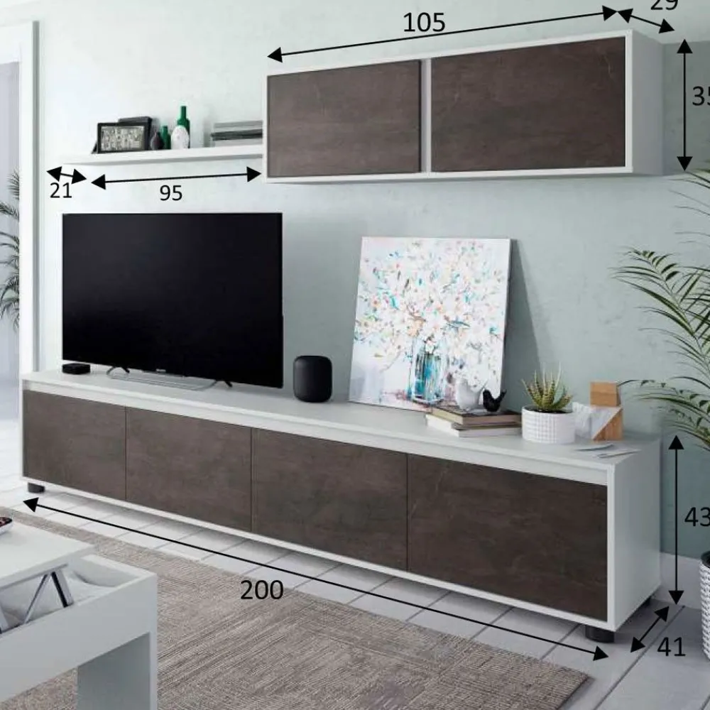 Conjunto para salón compuesto de un mueble de televisión con 4 puertas y un módulo superior de 2 puertas y un estante de colgar mucho más barato En here