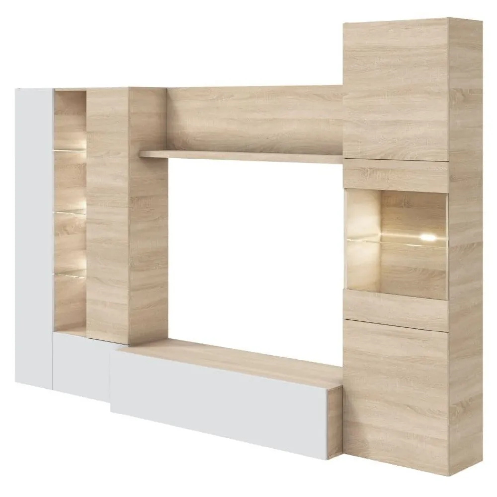 El mueble de salón Essential transforma por completo tu zona de estar, aportando una mezcla perfecta entre la calidez natural del Roble Canadian y el toque moderno del Blanco Brillo. Su diseño modular está pensado para salones que buscan amplitud y luminosidad, gracias a sus superficies claras y sus vitrinas con luces LED de 6000K que resaltan tus objetos decorativos favoritos. Esta pieza no solo decora, sino que crea una sensación de orden y armonía, convirtiéndose en el eje visual de la estancia donde la familia se reúne para disfrutar del mejor entretenimiento.