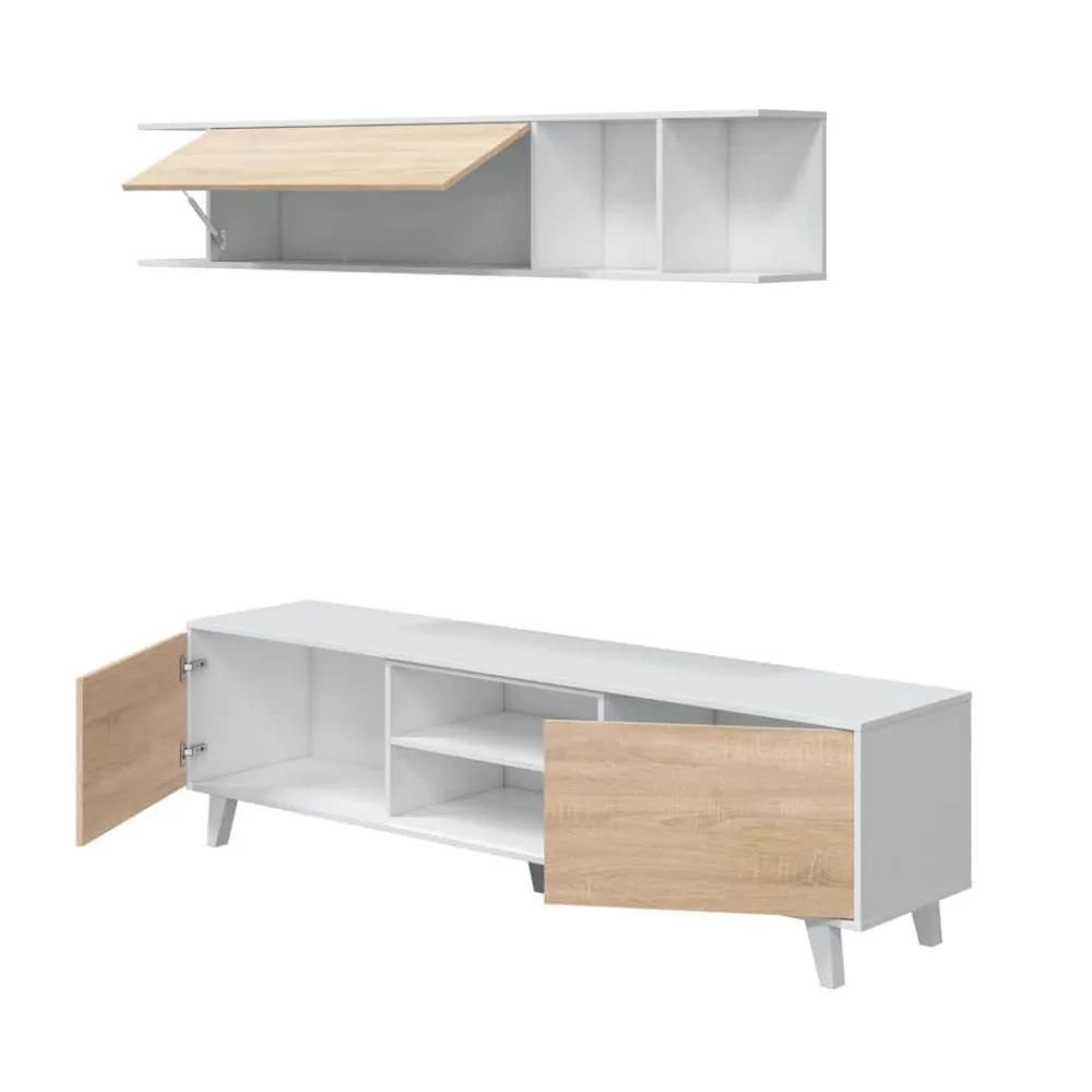 Conjunto para salón compuesto de un mueble de televisión con patas de 2 puertas y 2 huecos y un módulo superior con una puerta abatible