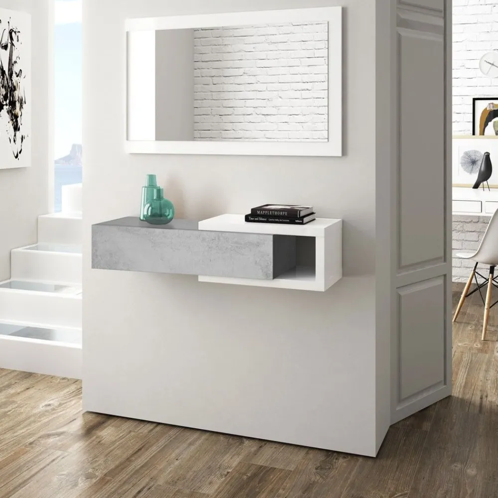 Un mueble de entrada de diseño moderno y con unos colores que actualmente son tendencia, como son el Blanco Artik y el Cemento. El mueble de entrada está compuesto por una consola con un cajón con tirador oculto tipo push y un espejo enmarcado.