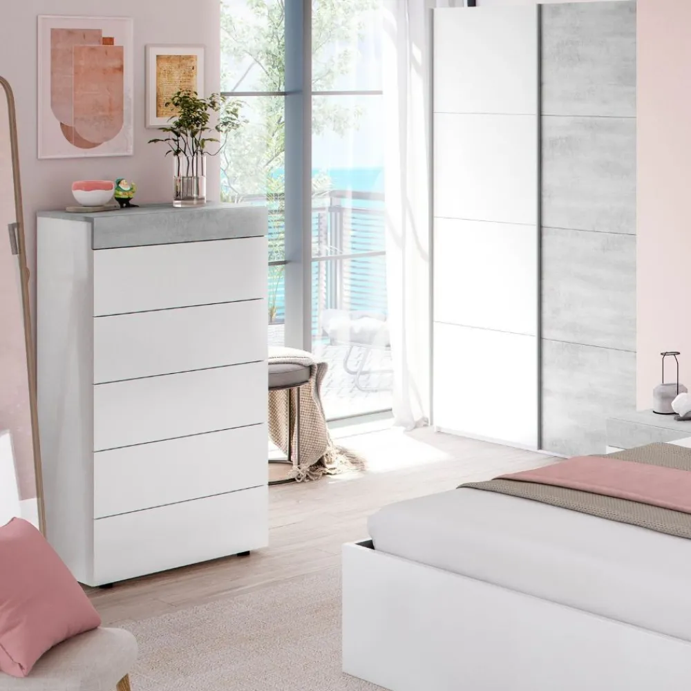 El sinfonier blanco Artik Tekkan combinado con cemento es una cajonera de cinco cajones para dormitorio, con tiradores ocultos e interior de los cajones en textil.