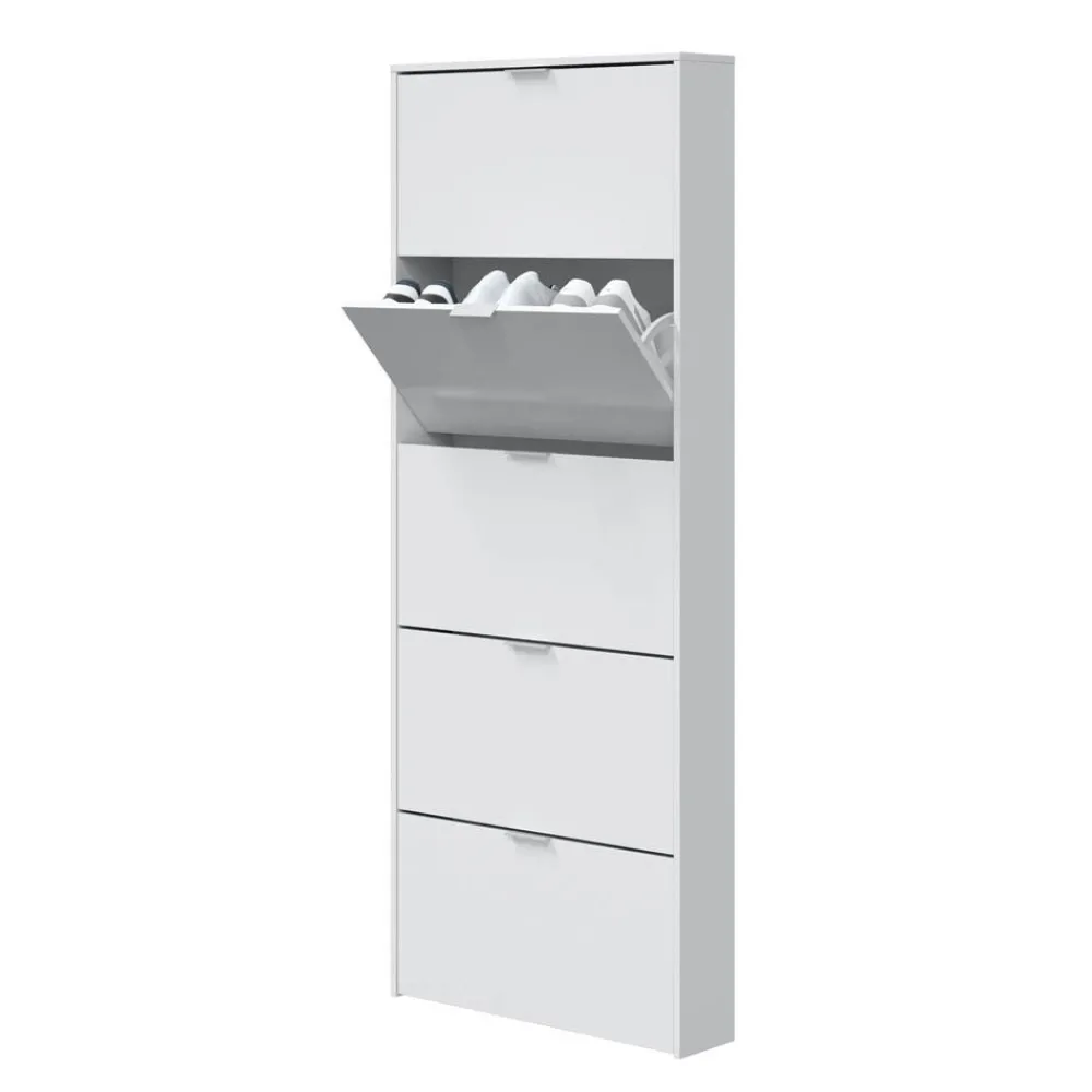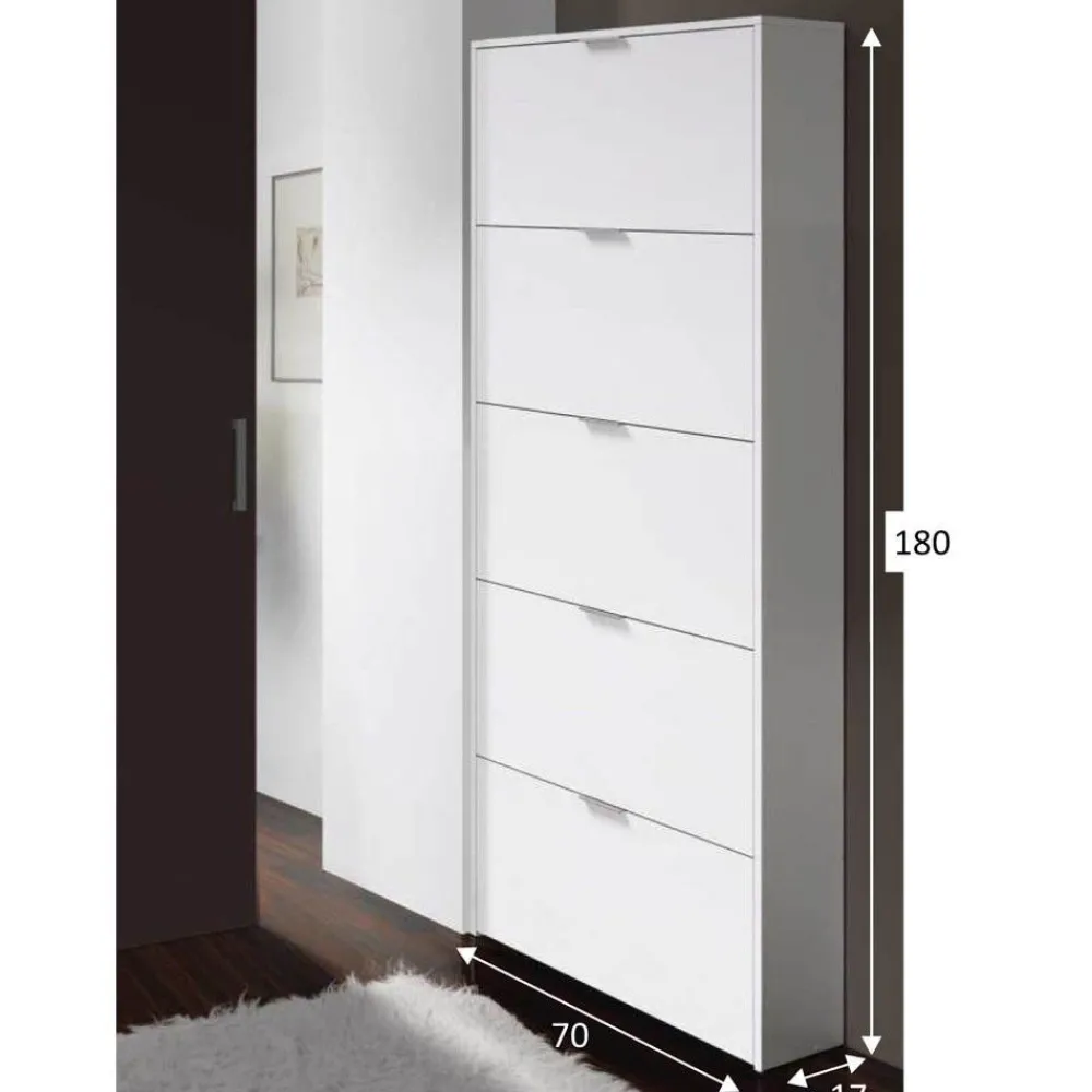 Armario zapatero con poco fondo, en color blanco, con cinco puertas batientes, nos permite guardar hasta 15 pares de zapatos.