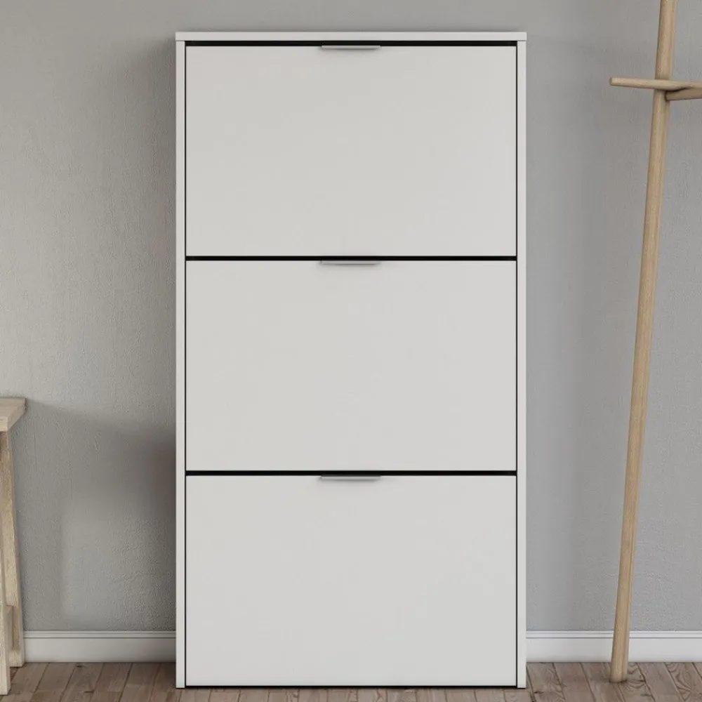 Mueble zapatero de tres puertas batientes en color blanco brillo, con capacidad de hasta 18 pares.