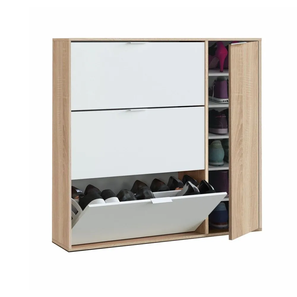 Si estás buscando una solución práctica, cómoda y con diseño para mantener tus zapatos ordenados y a buen recaudo, el de tres puertas abatibles y una puerta batiente es la opción ideal. Por su acabado en laminado en color roble Canadian y blanco, este tiene un estilo decorativo moderno de inspiración nórdica.