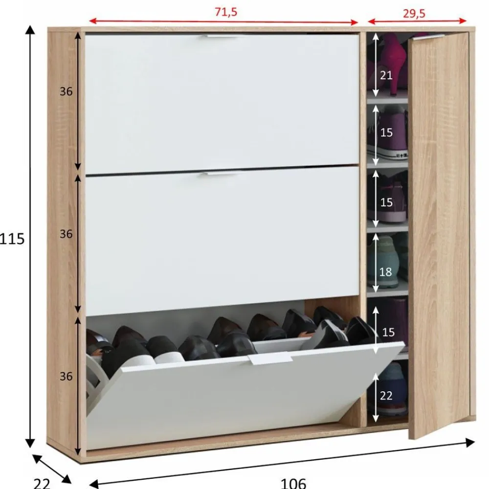 Armario zapatero en color roble Canadian combinado con blanco, dispone de 4 puertas, 3 abatibles y una batiente, con capacidad hasta para 30 pares de zapatos.