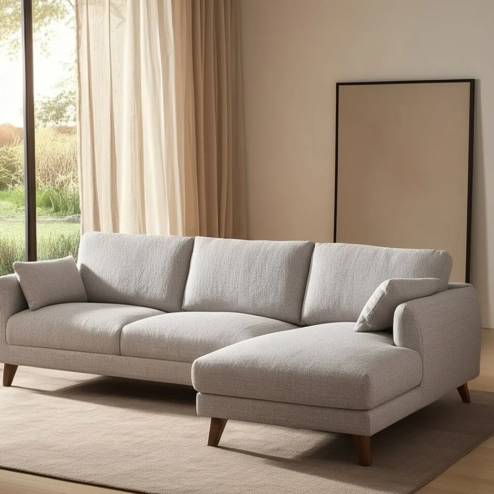 Material: estructura madera Patas: madera de caucho Tejido: 100% poliéster Gramaje: 390gsm. Cojines respaldo y laterales desenfundables con cremallera. Cojines asientos fijos no desenfundables. Medida cojines laterales: 45x28cm. Altura respaldo (desde asiento): 44cm. Profundo asiento: 55cm. Ancho asiento: 216cm Altura reposabrazos(desde suelo): 83cm. Altura asiento: 46cm. Altura patas: 13.5cm. Profundo asiento chaise longue: 117cm. Medida chaise longue: 88x150x86cm. Patas para montar. Cumple normativa: EN12520:2016