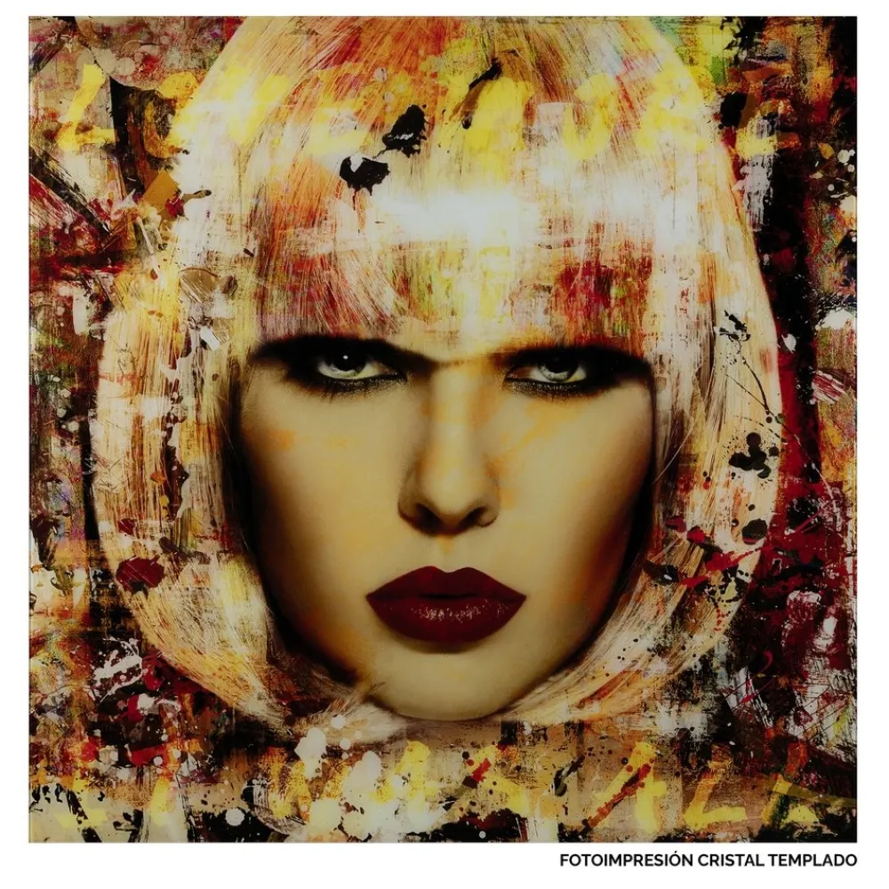 Este cuadro en cristal templado es una declaración de estilo y audacia. La imagen de la mujer, con una mirada intensa y rodeada de un estallido de colores, aporta una atmósfera de modernidad y energía. Ideal para decoraciones contemporáneas o de estilo industrial, esta pieza se adapta perfectamente a cualquier ambiente que busque un toque artístico y vibrante.