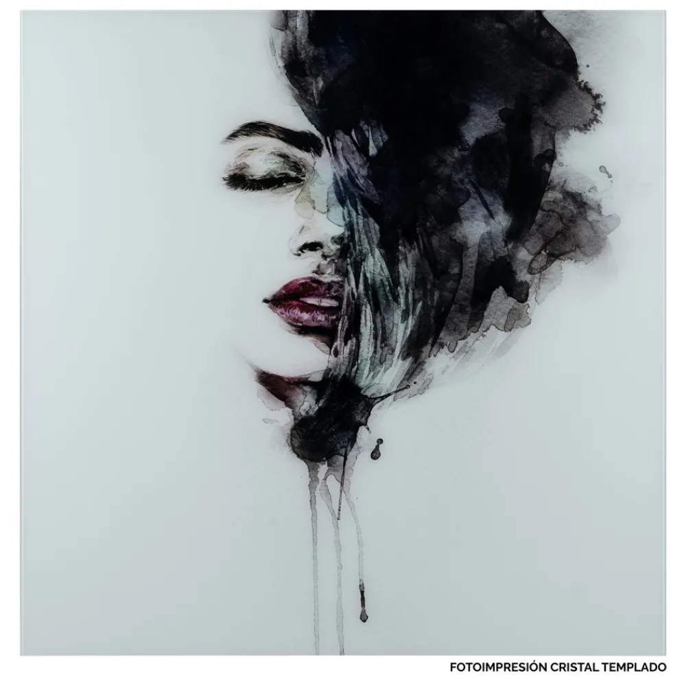 Cuadro decorativo en cristal templado con una imagen artística de mujer en estilo acuarela y abstracto. Ideal para añadir un toque moderno y sofisticado. Incluye anclajes de metal para fácil instalación.