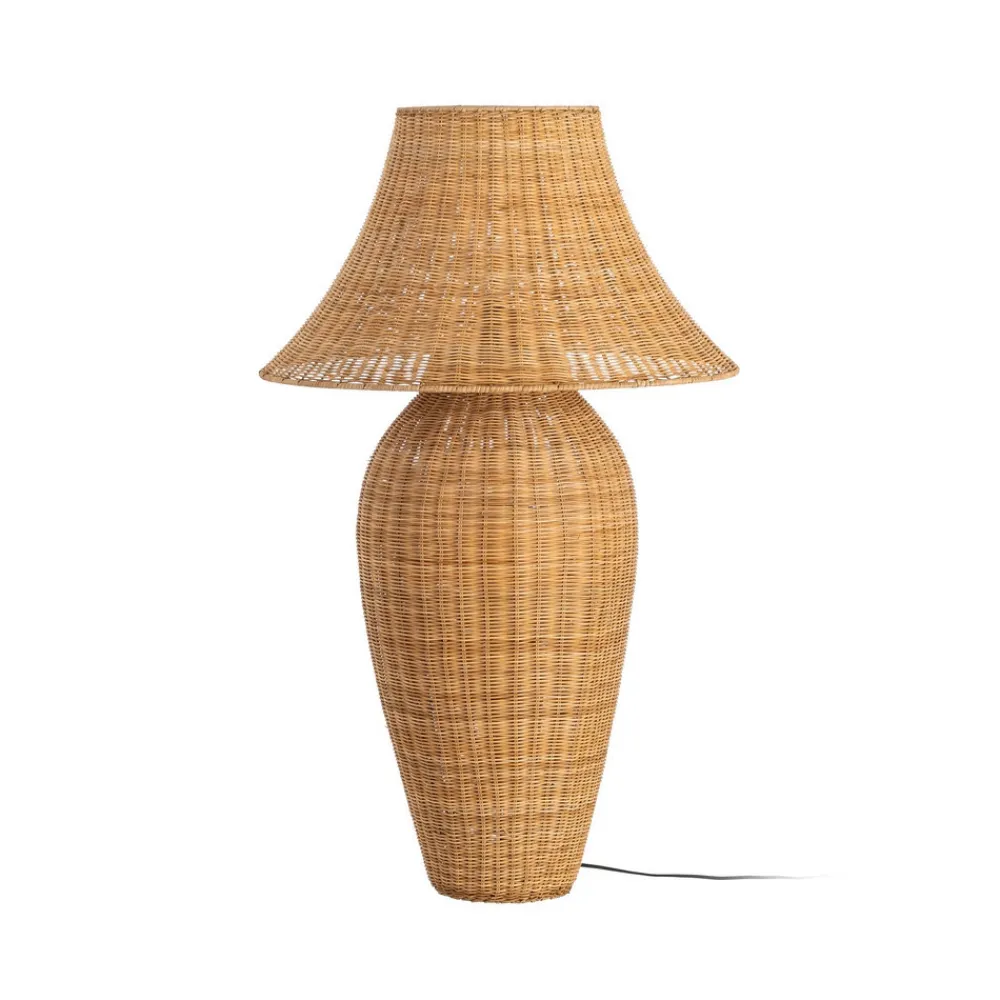 Material: ratán – metal Medida tulipa: 60x35cm. Medida base: 36x74cm. Peso lámpara: 2.8kgr. Casquillo: E27 Bombilla no incluida. Largo cable: 180-200cm.
