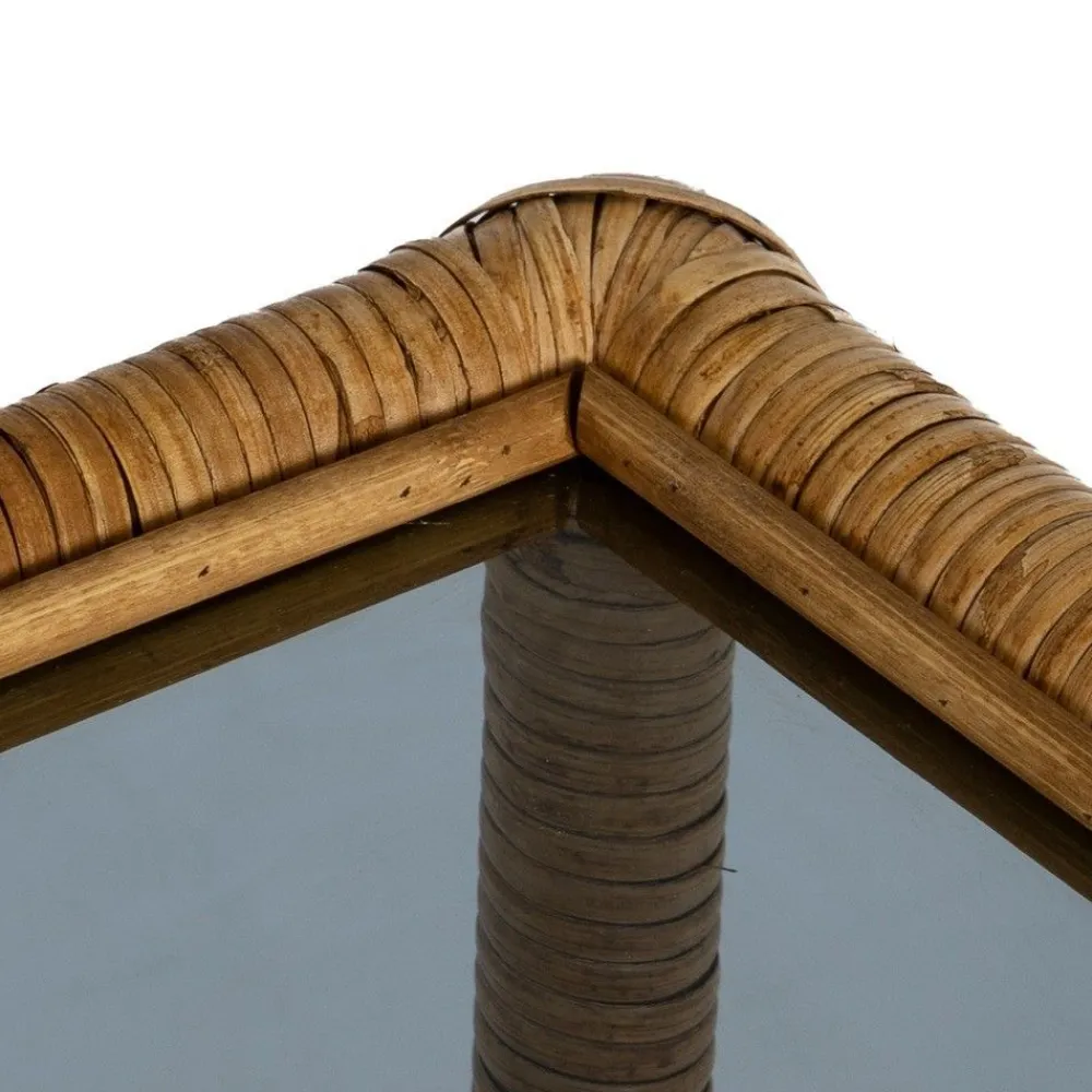 El ratán empleado en esta pieza destaca por su ligereza y resistencia, proporcionando un soporte duradero para el cristal. Su diseño abierto en la parte inferior incluye un estante adicional también en ratán, que brinda espacio para almacenar o exhibir objetos decorativos.