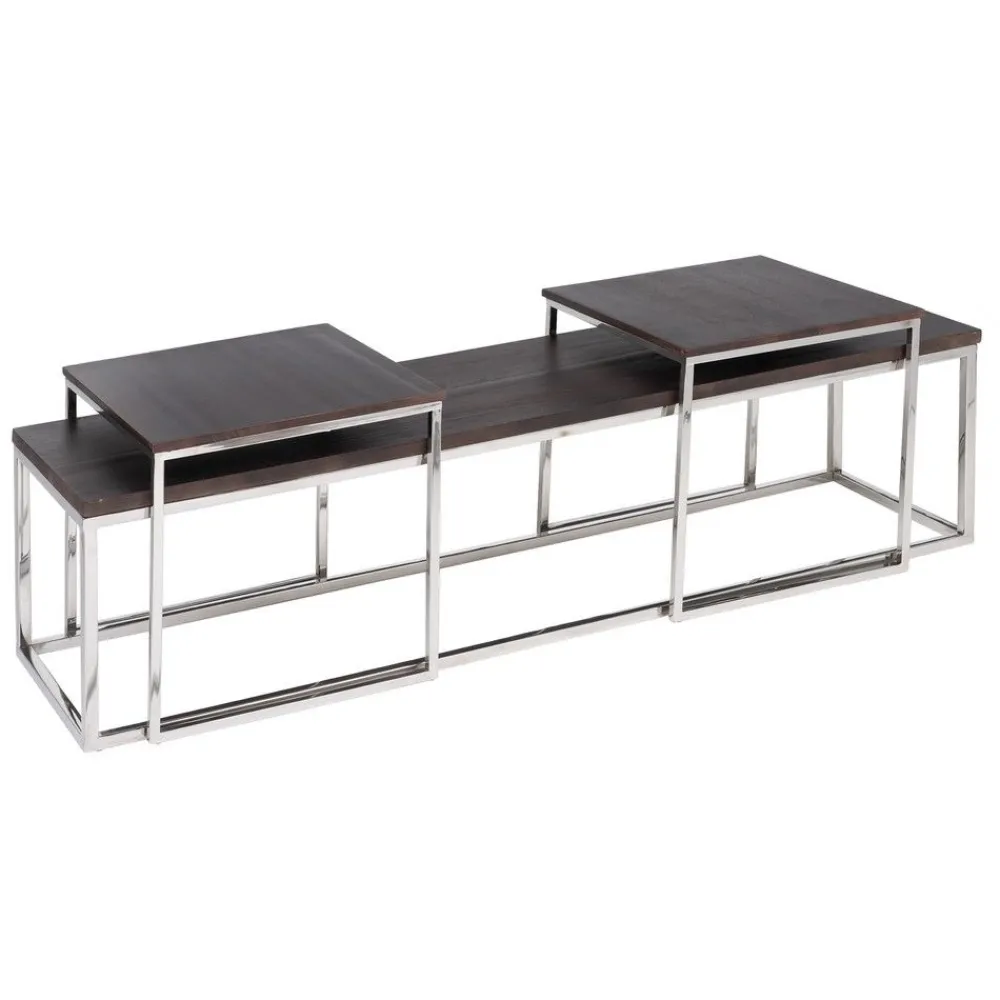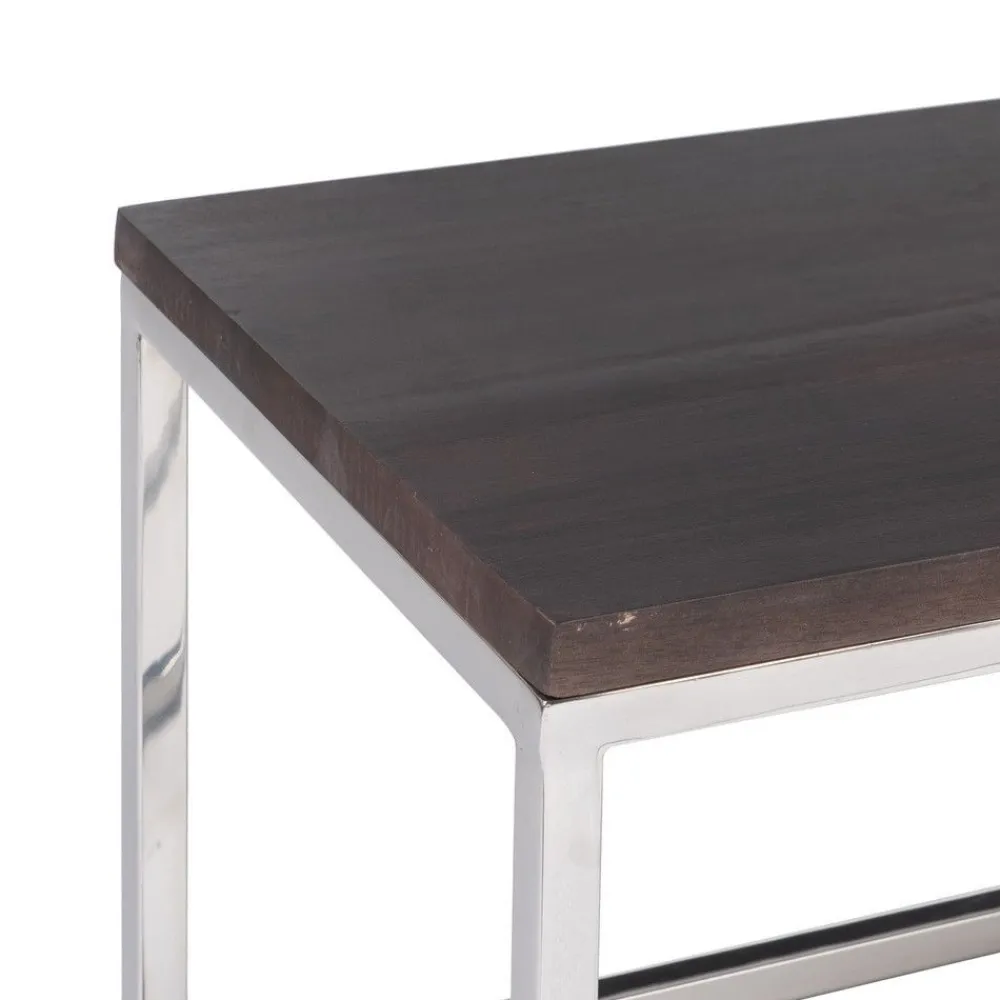 Conjunto de tres mesas nido, estructura de acero inoxidable color plata, encimera en madera de Mango color marrón.