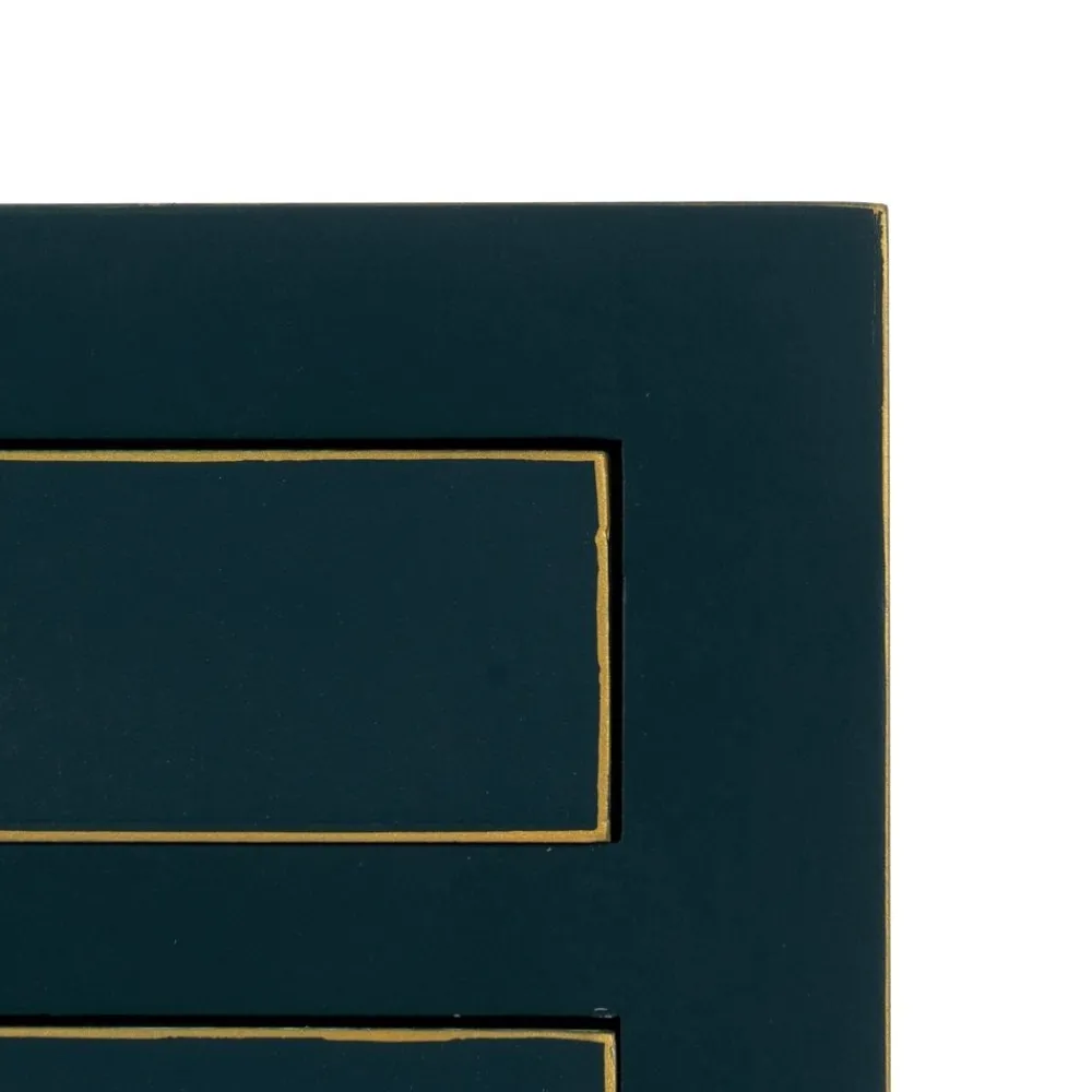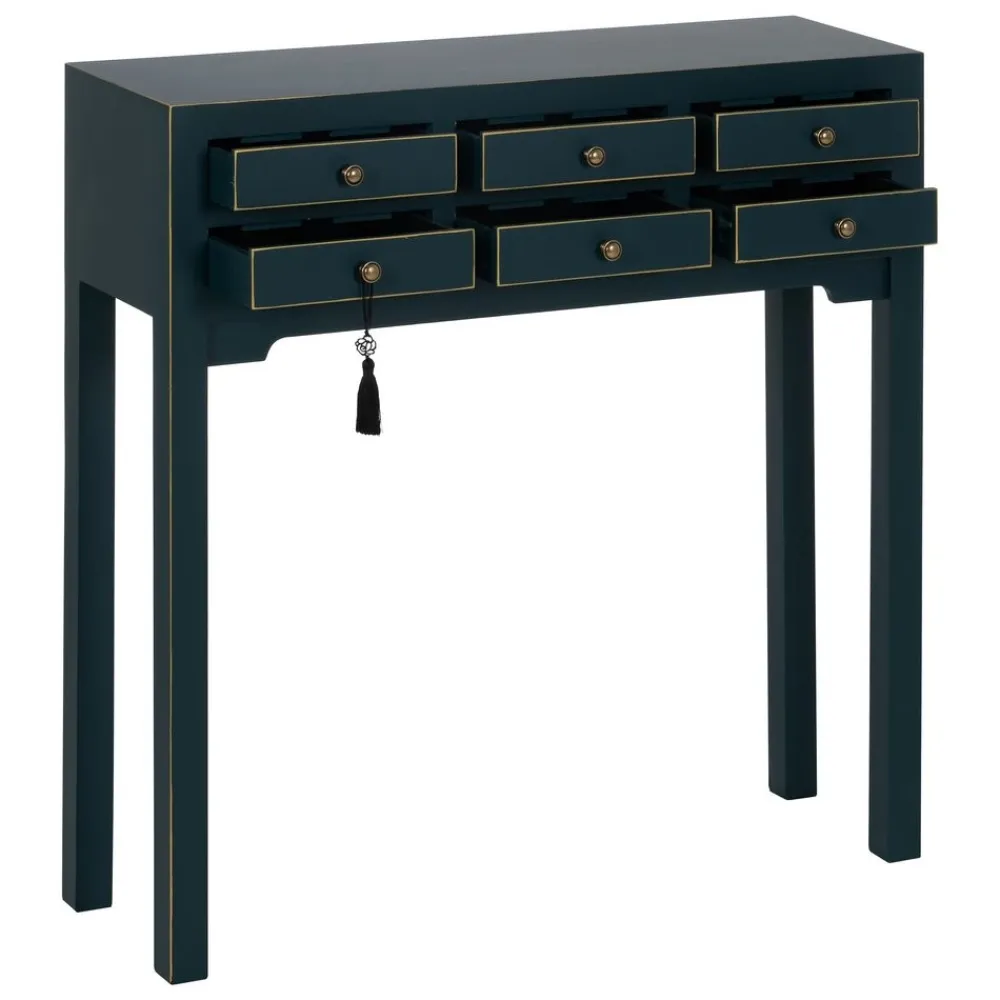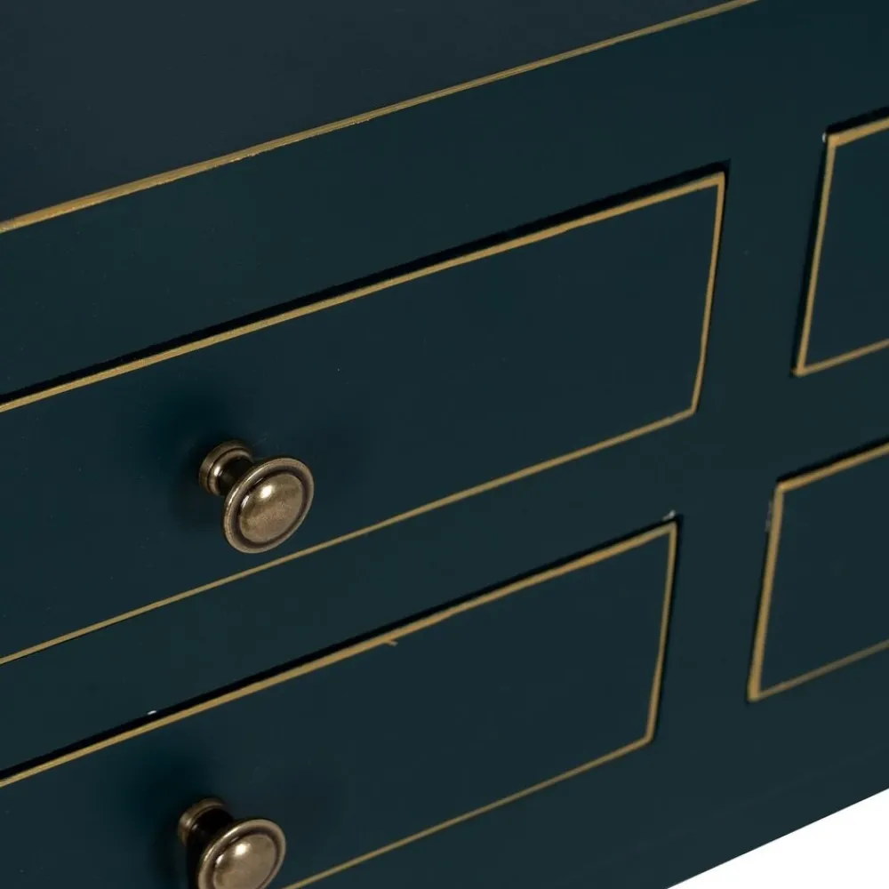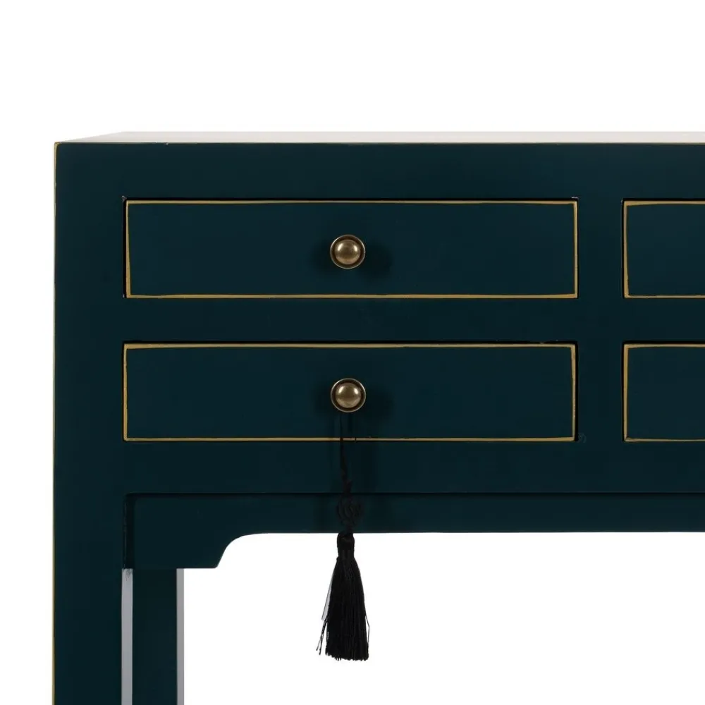 La consola Oriente azul es una pieza decorativa que combina madera de abeto y DM con acabados dorados en los bordes y pomos envejecidos. Sus 6 cajones funcionales y su diseño simétrico la convierten en el complemento perfecto para recibidores, salones o dormitorios con estilo oriental. No requiere montaje.