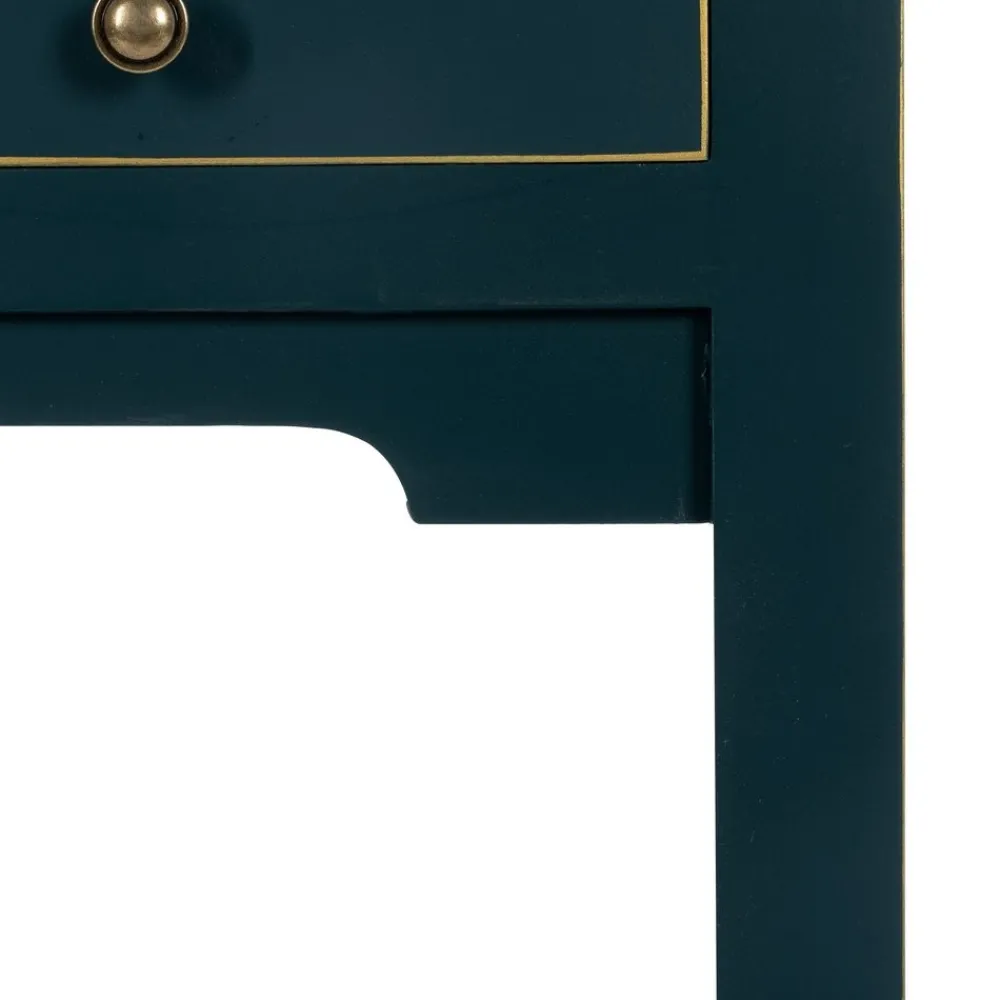 Consola Oriente azul con pomos dorados envejecidos y bordes decorativos
