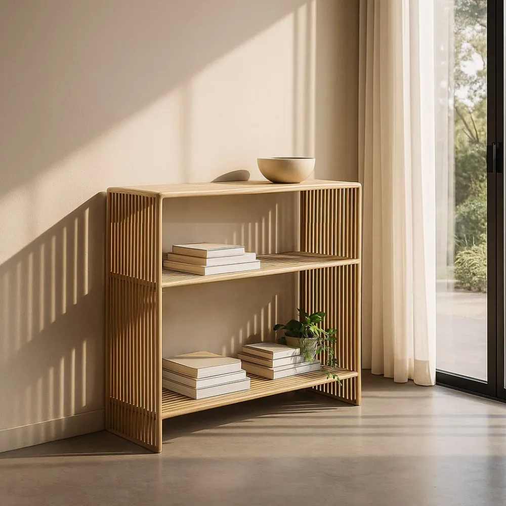 Material: Madera de teca reciclada. 3 estantes. 2 huecos