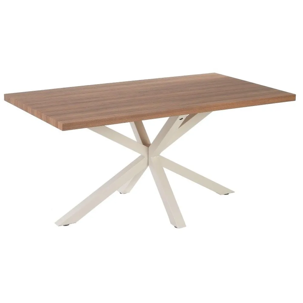 La mesa de comedor natural y blanco combina elegancia y funcionalidad en un diseño único. Su tablero de madera DM con acabado natural y patas cruzadas de metal blanco la convierten en una pieza ideal para cualquier comedor.