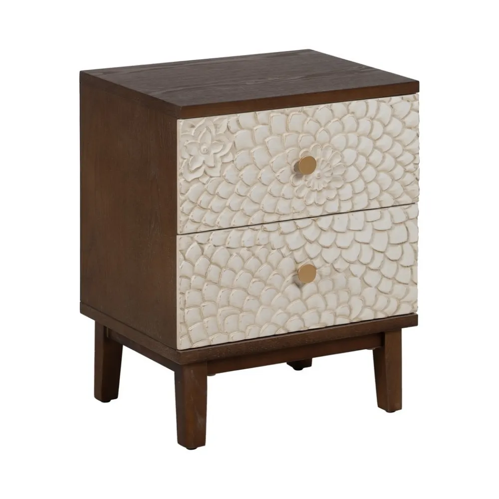 Mesita de Noche de Madera Tallada con 2 Cajones – Estilo Rústico y Funcional
