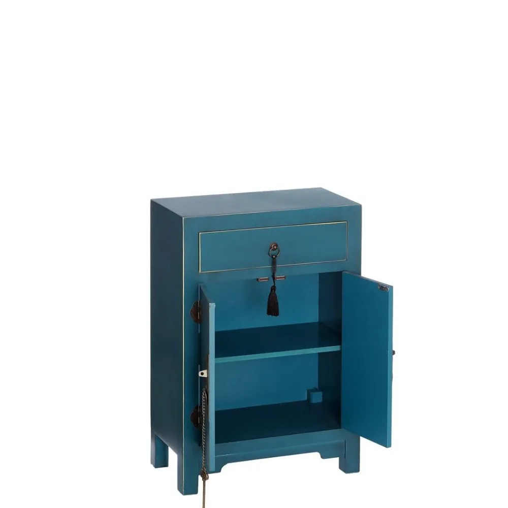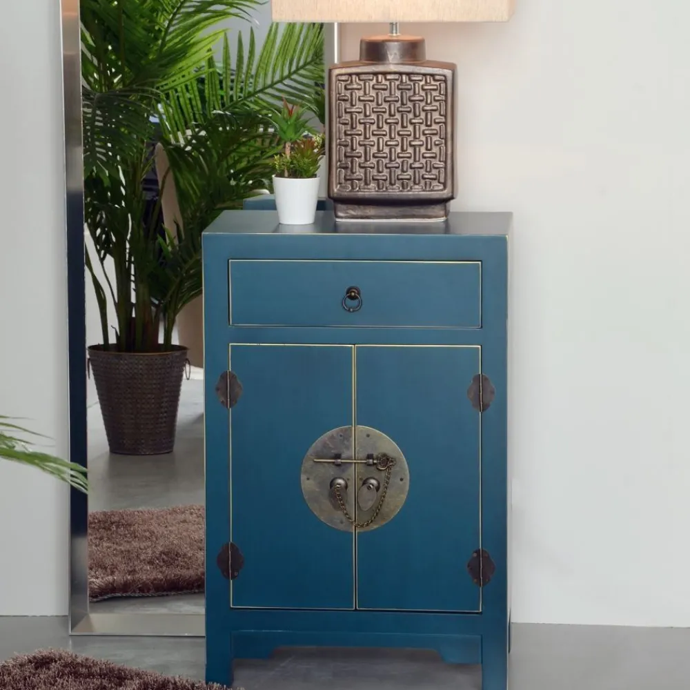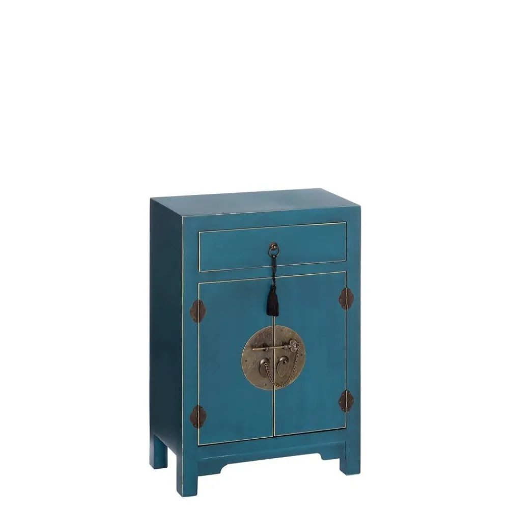 Mesilla de noche de estilo oriental en color Azul con 2 puertas y 1 cajón, perfecta para decorar tu habitación.
