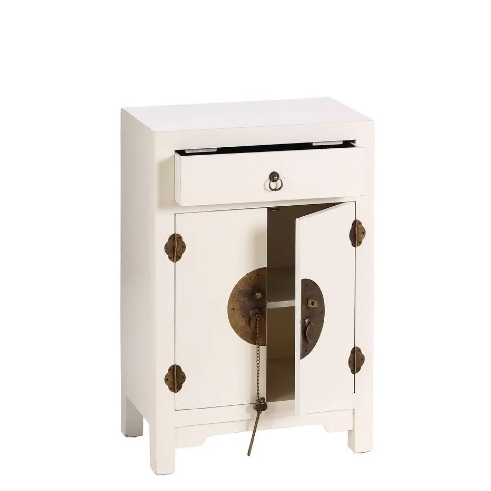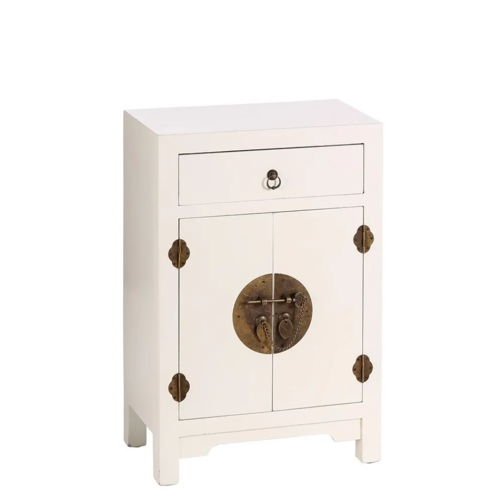 Mesilla de noche de estilo oriental en color blanco, tirador en forma de anilla en el cajón, con dos puertas