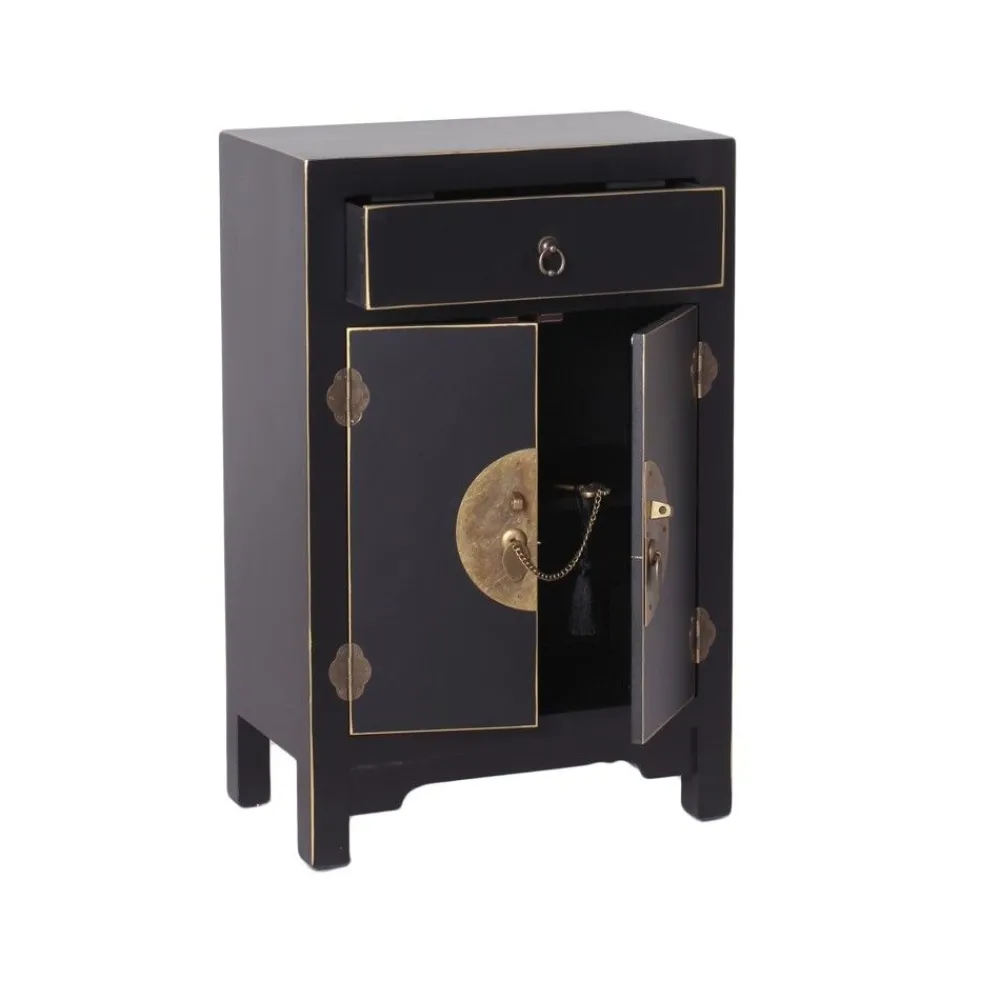 Mesita de noche de estilo oriental en color negro con detalles en color oro. Dispone de dos puertas que esconden un estante interior y un cajón para guardar todo lo que desees.