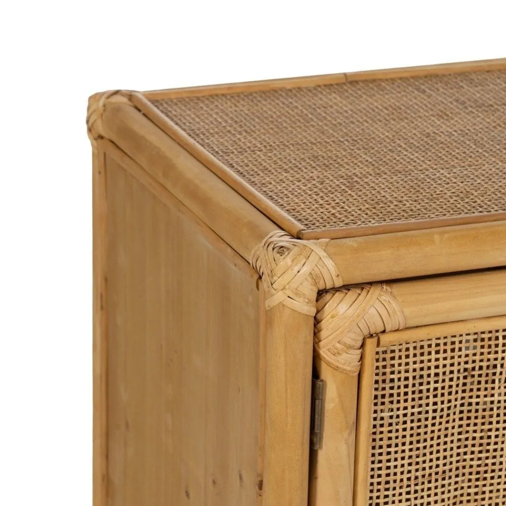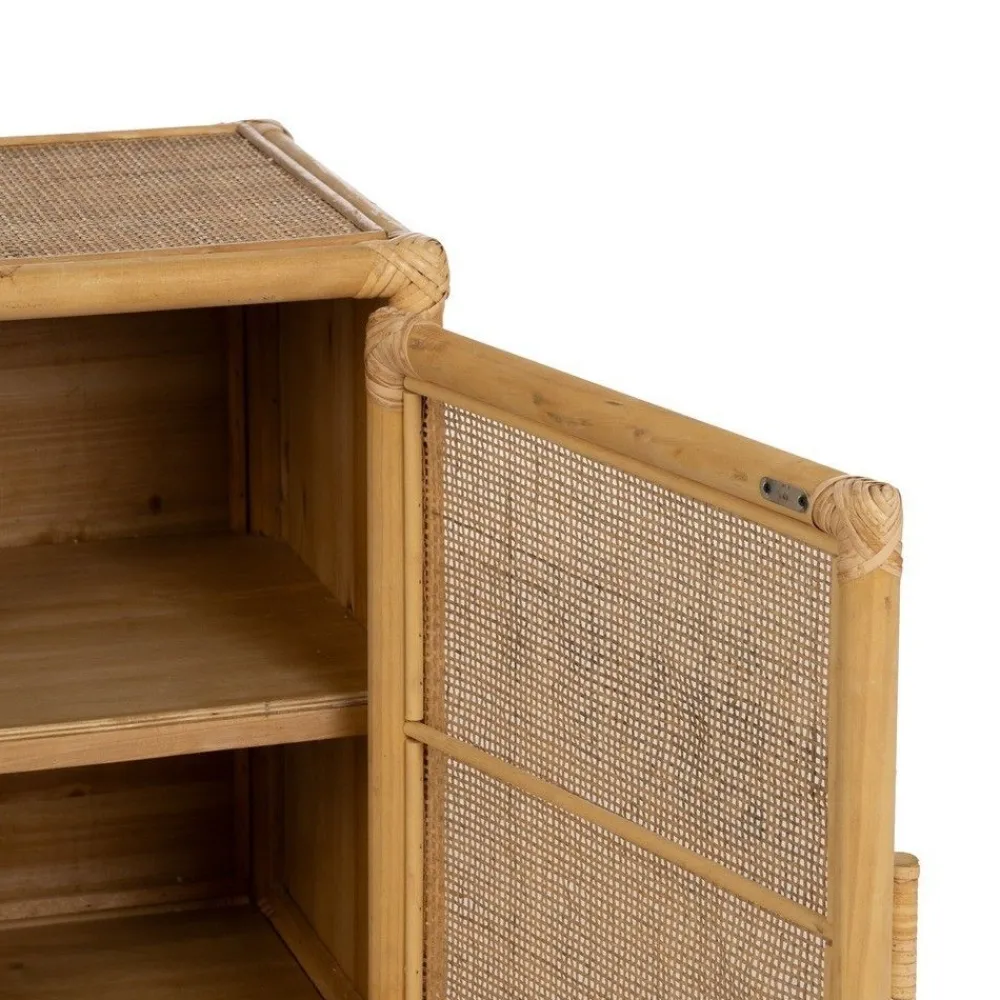 Este encantador destaca no solo por su estética natural, sino también por su funcionalidad. Con dos puertas de ratán tejido, permite almacenar discretamente objetos y mantener el orden en cualquier estancia. Su acabado en color natural y la textura única del ratán lo convierten en una pieza ideal para decoraciones de estilo rústico, bohemio o incluso nórdico.
