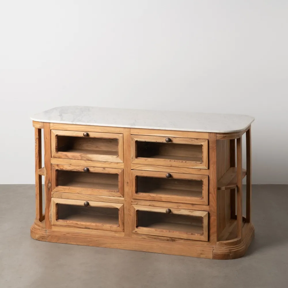 IXIA Muebles De Salón^Isla Aparador De 12 Cajones Vitrina En Madera De Mango Natural Y Mármol 155 X 88 X 50 Cm