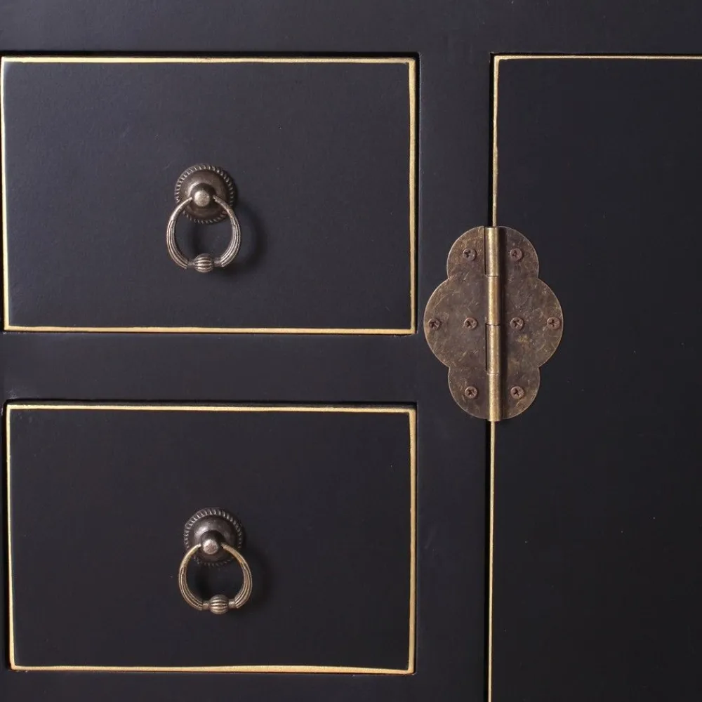 Mueble para recibidor auxiliar, de estilo oriental en negro con detalle oro. Dispone de una hilera de 6 cajones pequeños en la parte izquierda y dos cajones y dos puertas en la parte derecha.