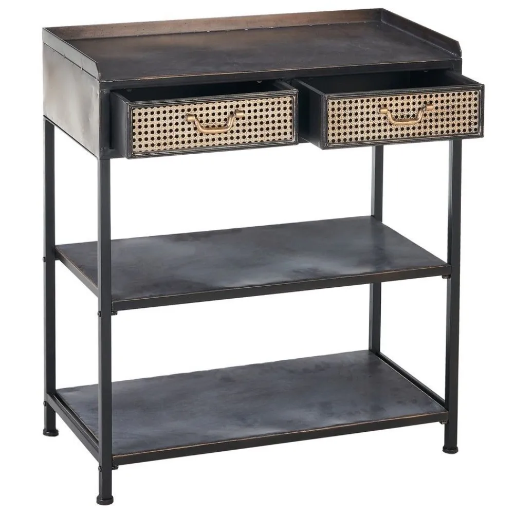 El mueble recibidor Brick combina estilo industrial y funcionalidad, ideal para cualquier entrada. Fabricado en hierro con acabado negro y marrón, incluye cajones y estantes para mayor comodidad y almacenamiento.