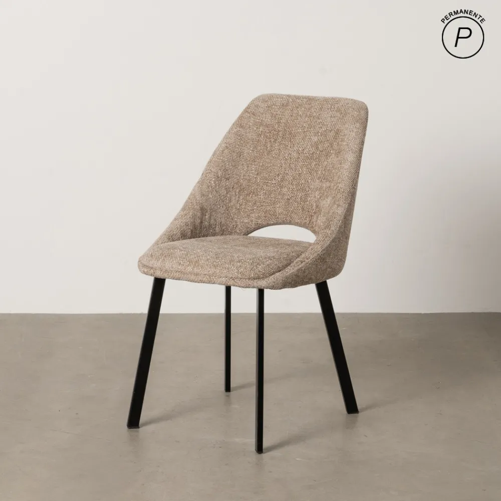 Material: Tejido – Metal. Tapizado: 100% Poliéster. Color del tapizado: Taupe. Color de las patas: Negro. Relleno: Foam. Densidad: 24 kg/m3. Material de las patas: Metal. Altura del asiento: 48 cm. Altura del respaldo: 39 cm . Anchura del asiento: 39 cm. Profundidad del asiento: 46 cm. Altura del respaldo: 39 cm. No apilable. Peso máximo soportado: 120 kg. Cumple normativa EN16139:2013 (Catering).