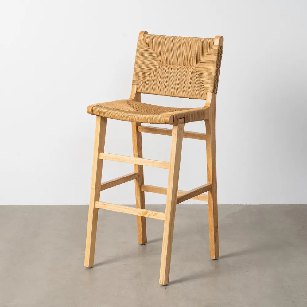 Material: madera de caucho – cuerda de papel. Altura asiento: 75cm. Altura respaldo: 34cm. No precisa montaje. Cumple normativa: EN12520