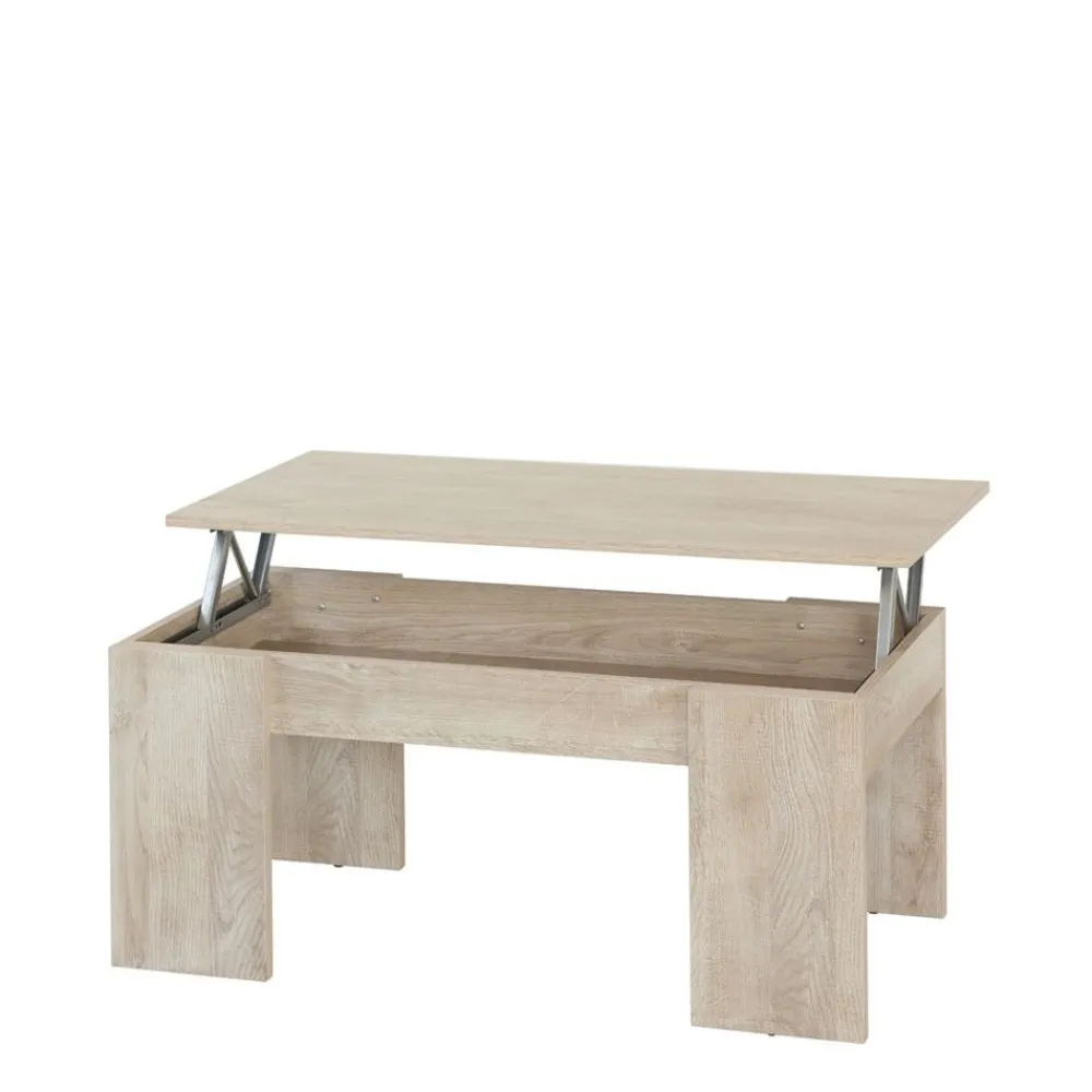 Mesa elevable auxiliar de centro, fabricada en melamina de alta calidad color roble Sonoma, con una encimera que se eleva 14 cm aproximadamente y nos acerca la superficie de la mesa hasta el sofá o sillón donde estemos sentados para poder trabajar o comer cómodamente. Dispone de un departamento oculto cuando la tapa está cerrada.