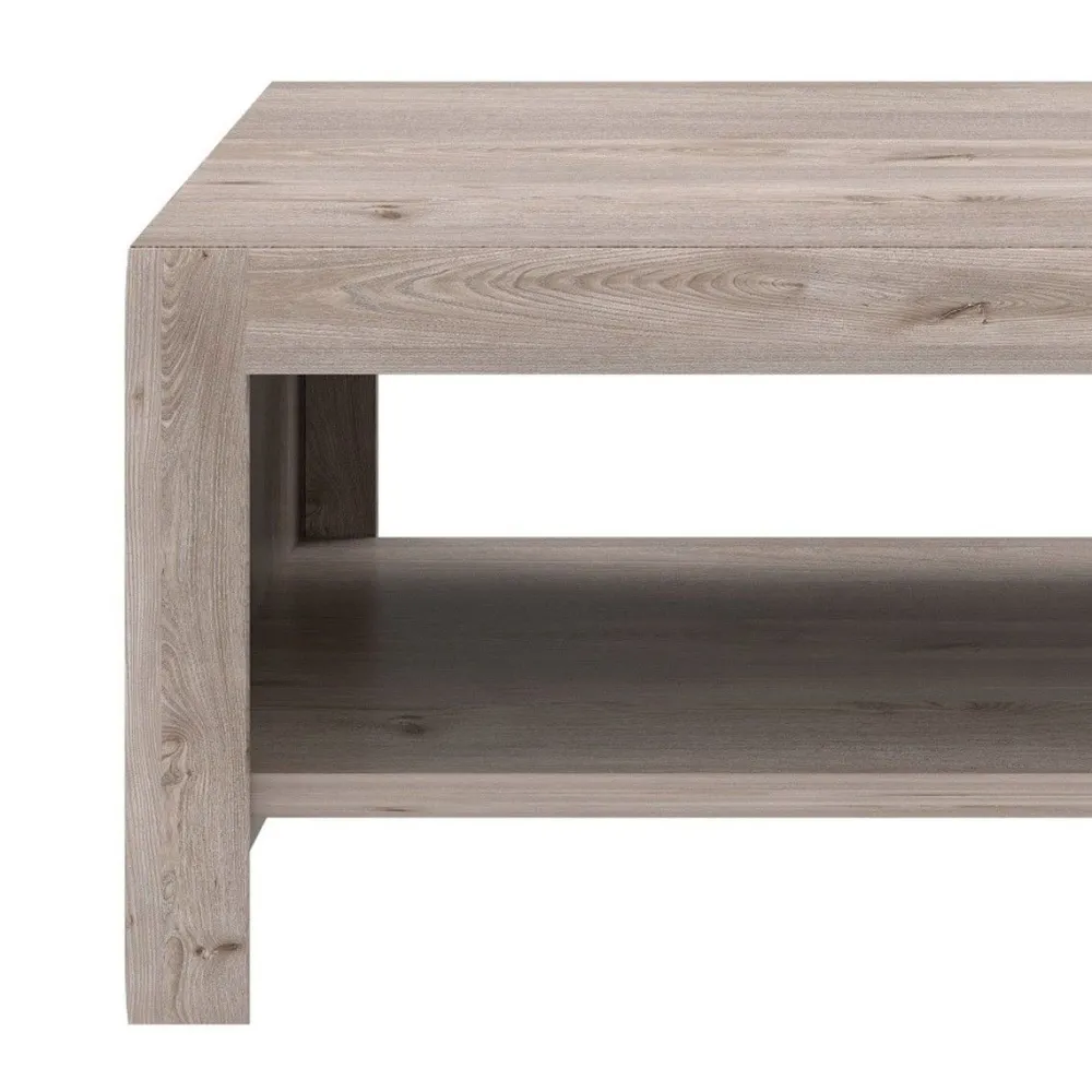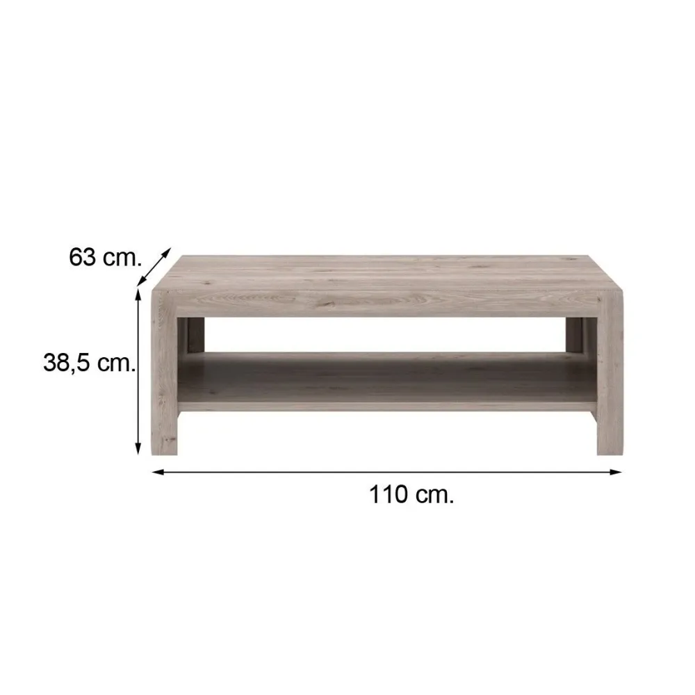 La mesa de centro fija Valencia está fabricada en laminado sintético color roble Nelson, una mesa con aspecto nórdico y un diseño clásico pero que combina también con los salones de estilo más moderno. En la parte central y uniendo a los dos patas se incluye un estante que hace la función de revistero.